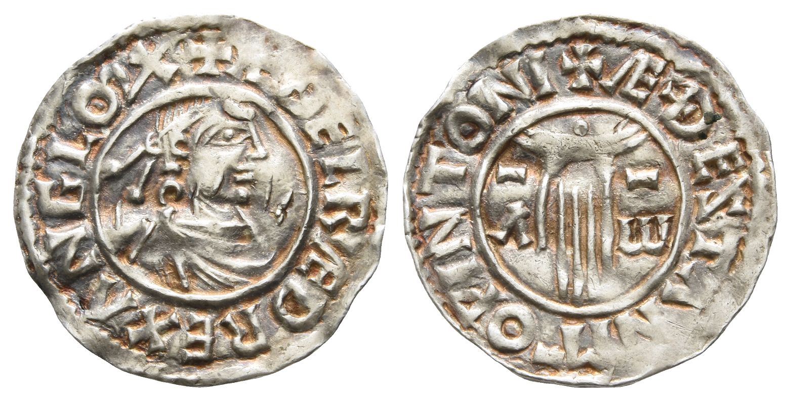 ✠ ÆÐELRÆD REX ΛNGL ORX (OR ligate), draped bust to right / ✠ ÆÐESTΛN M–O PINTONI, Manus Dei descending from clouds; barred Λ ധ flanking. North 766; SCBC 1144. 1.48gr, 21mm, 6h.