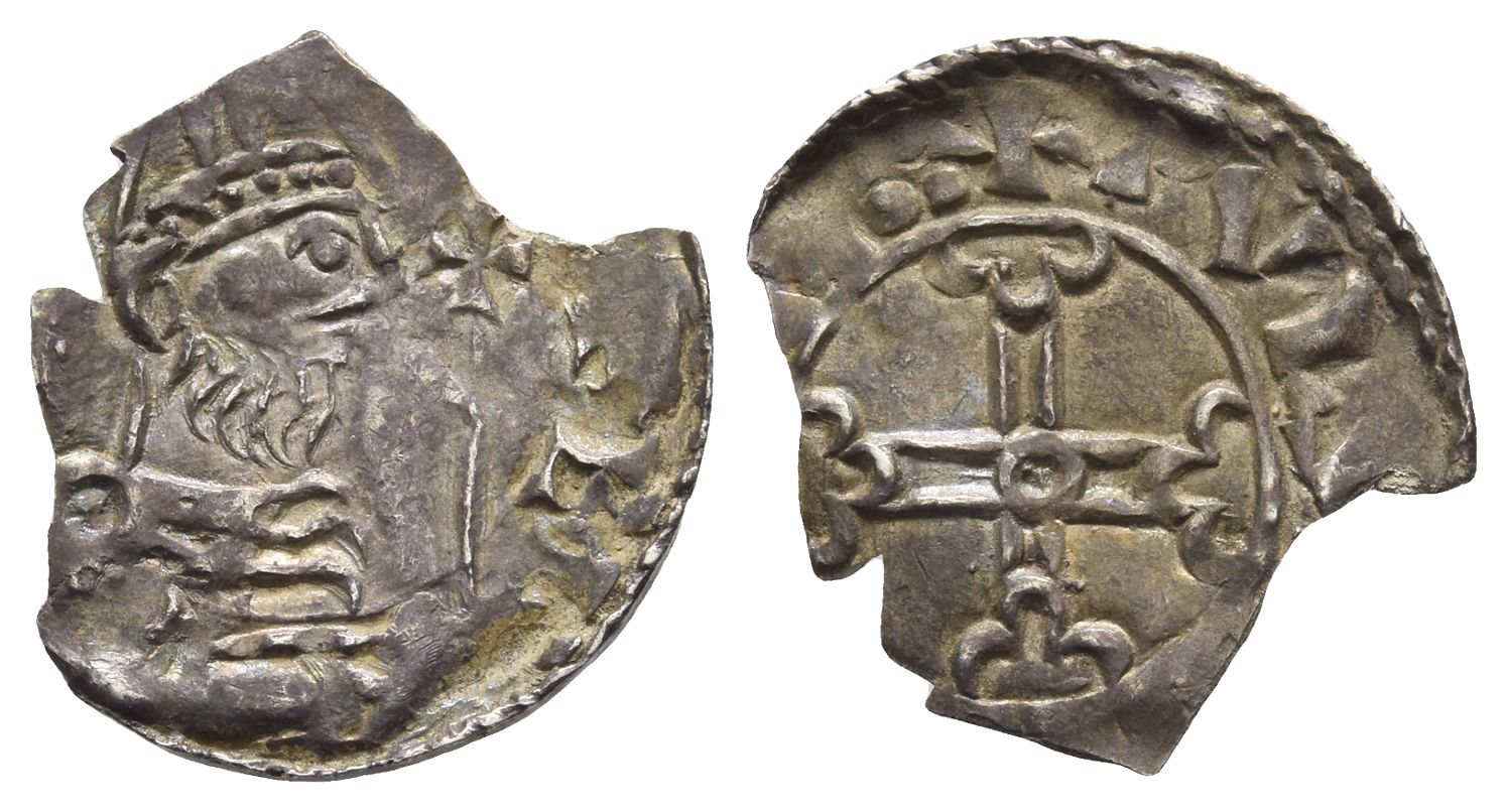 [✠ ED]PER [D REX], helmeted and draped bust to right, holding cross-tipped sceptre / ✠ PVLS(?)[...], voided short cross with pellet-in-annulet centre and triple crescent ends; annulet in first quarter. North 825; SCBC 1179. 0.89gr, 19mm.