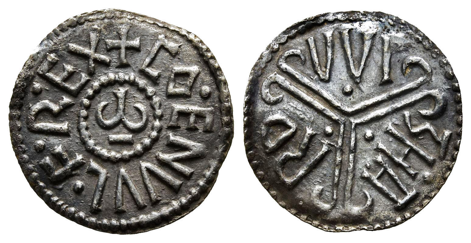 London mint. Wigheard, moneyer. Tribrach type. Struck 798-805. + Cꕺ•ENVV•LF R•EX, Mercian M with horizontal line above; all within pelleted circle / VVI-GHA-RD within angles of tribrach moline. Naismith L15c&e; North 342; SCBC 914. 1.40gr, 20mm, 2h.