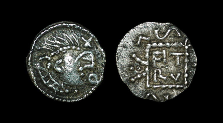 Circa 680-710 AD. 'Saroaldo' Type 11. Obv: bust right, small cross in front of hair, annulet below nose. Rev: standard enclosing FIT/RV legend. Silver, 1.21 grams.