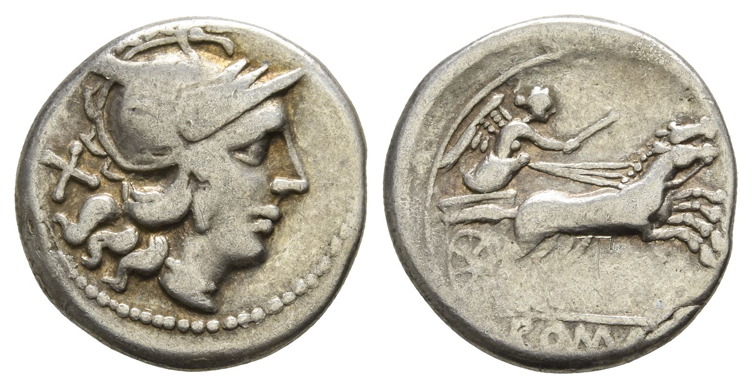 Helmeted head of Roma to right; X (mark of value) behind / Victory driving biga to right, holding reins and goad; ROMA in linear frame below. Crawford 197/1a; BMCRR Italy 428; RSC Anonymous 6. 3.74gr, 18mm, 7h.