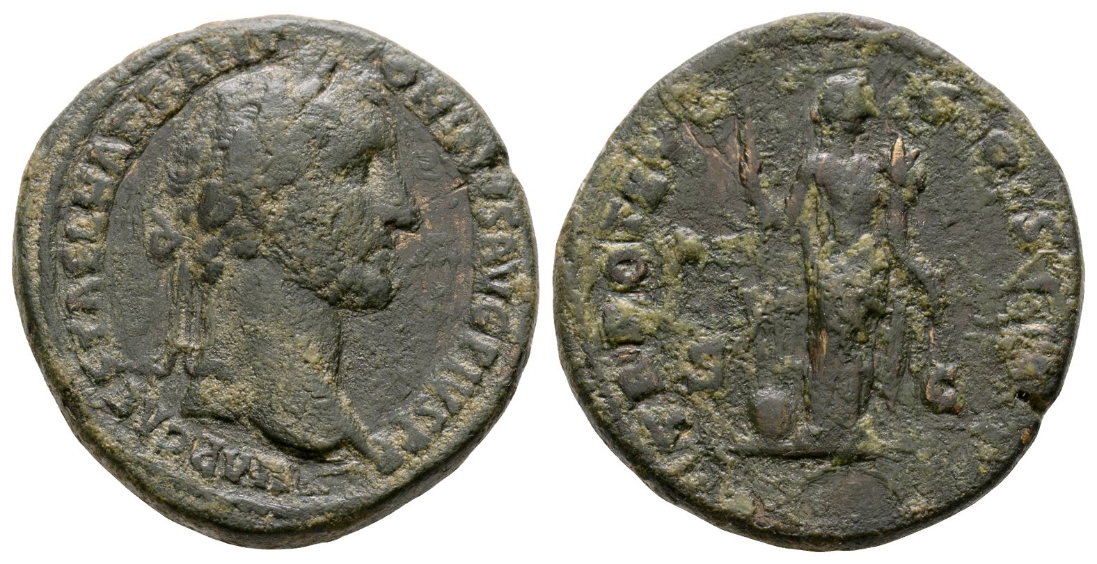 Rome mint; struck AD 151-152. IMP CAES T AEL HADR ANTONINVS AVG PIVS P P, laureate head to right / TR POT XV COS IIII, Fortuna standing facing, head to right, holding rudder on globe with right hand and cornucopia with left; S C across fields. RIC III 888; Cohen 958; BMCRE 1885. 25.45gr, 32mm, 6h