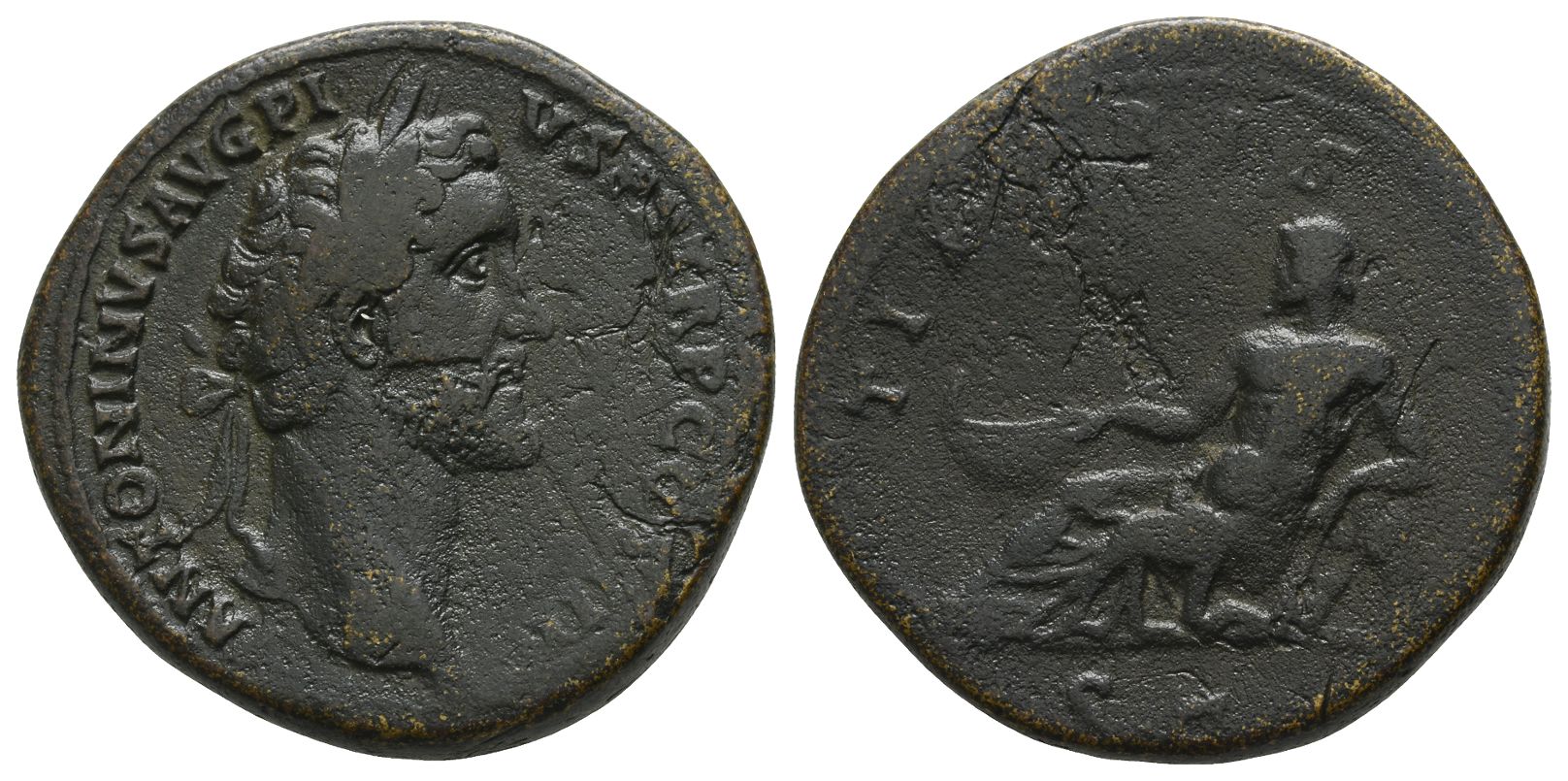 Rome mint; struck AD 140. ANTONINVS AVG PIVS P P TR P COS III, laureate head to right / TIBERIS, Tiber reclining to left, leaning on urn which pours out water, resting right hand on prow and holding reed; S C in exergue. RIC III 642a; Cohen 819; BMCRE 1313. 28.04gr, 33 mm, 7h.