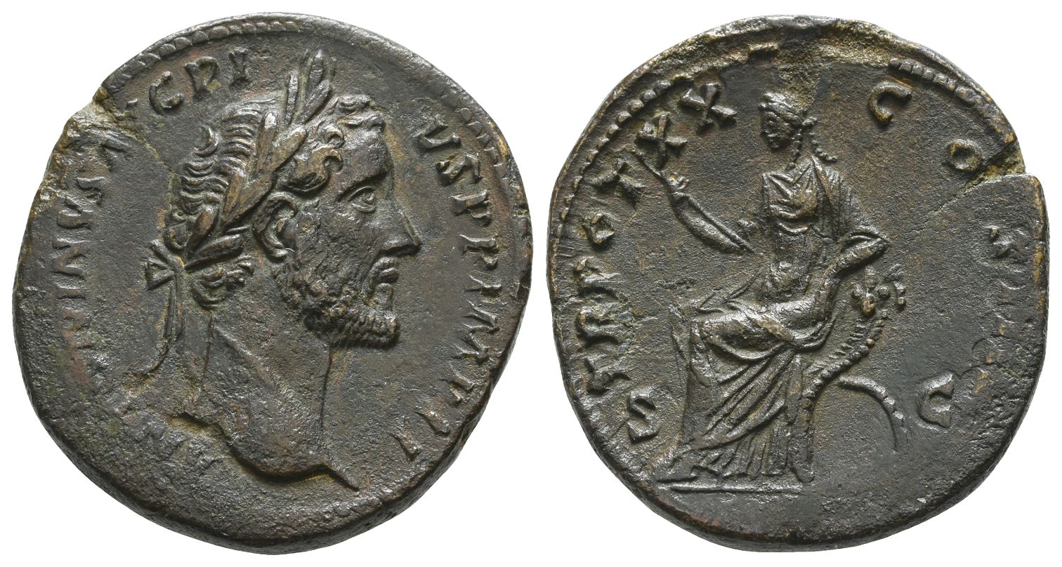 ANTONINVS AVG PIVS P P IMP II, laureate head to right / TR POT XX COS IIII, Securitas seated to left, holding sceptre, on chair formed of two cornucopiae; S C across field. RIC III 967; BMCRE 2016. 25.02gr, 33mm, 12h.