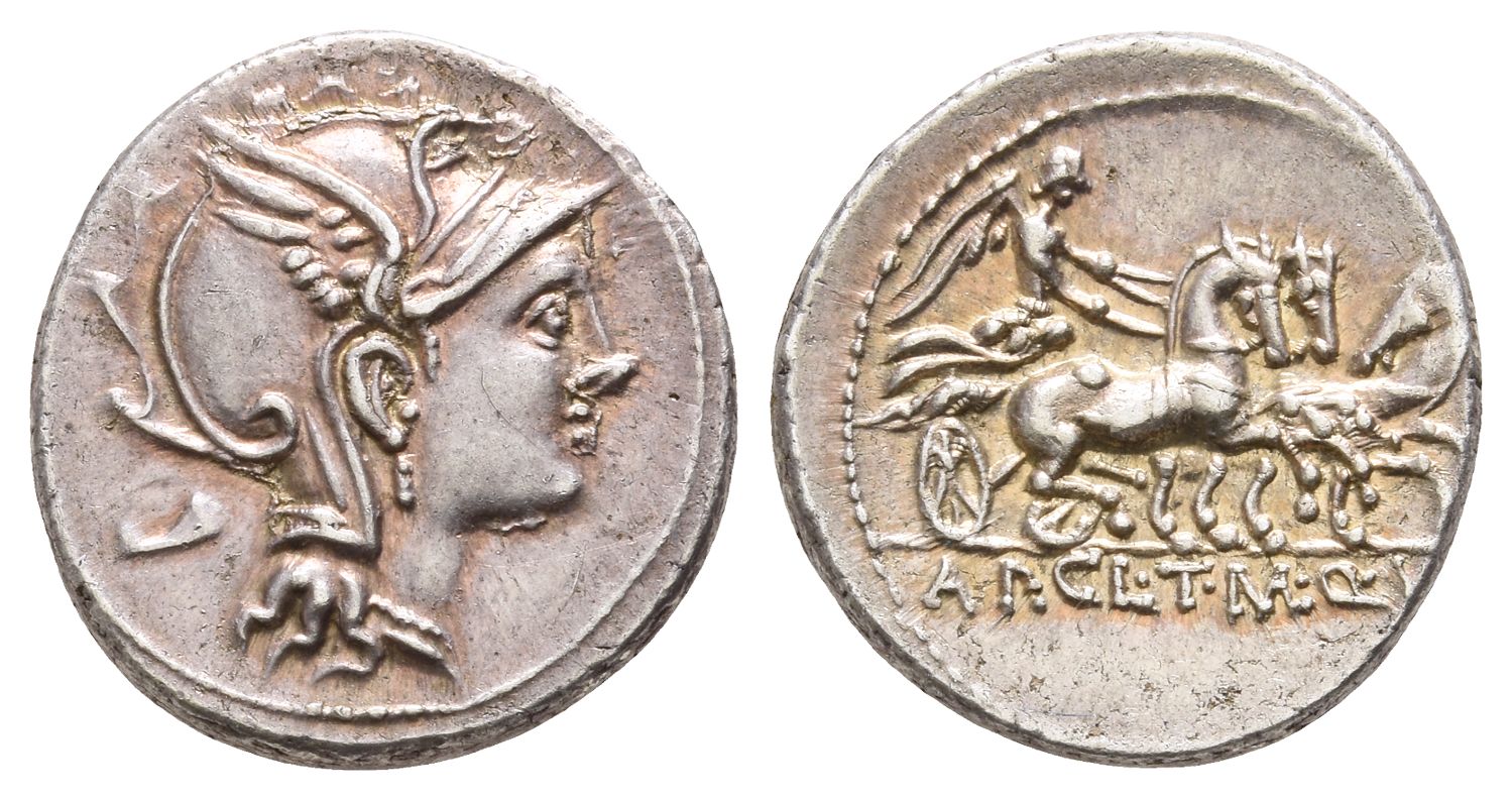 Helmeted bust of Roma to right; quadrangular device behind / Victory in triga to right, one horse looking back; AP•CL•T•MAL(ligate)•Q•VR(ligate) in exergue. Crawford 299/1a; RSC Claudia 2. 3.90gr, 17mm, 12h.