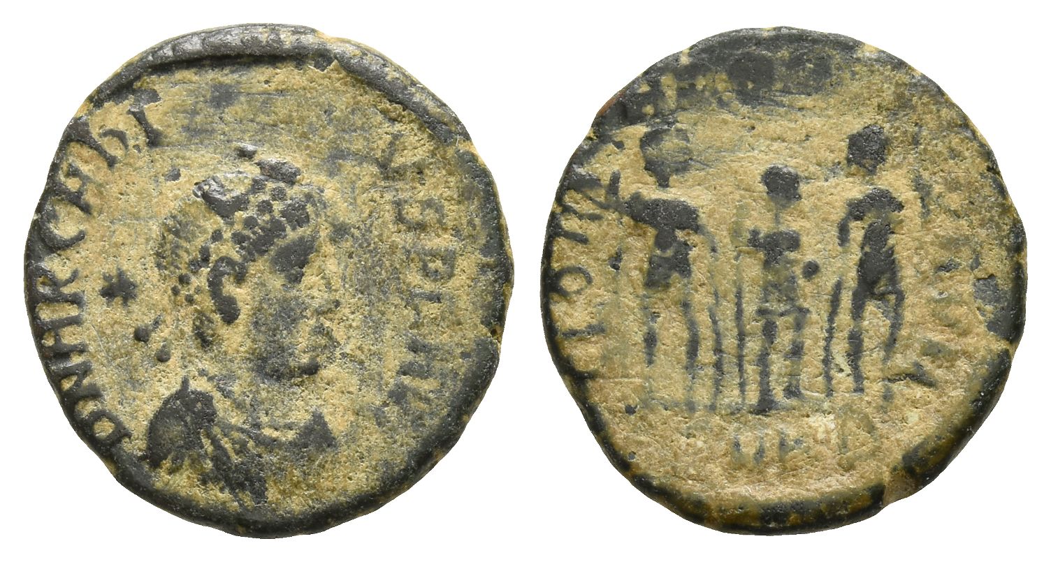 D N ARCADIVS P F AVG, pearl-diademed, draped and cuirassed bust to right; star behind / GLORIA ROMANORVM, three emperors standing facing: on right and left, Arcadius and Honorius, heads turned towards each other, each holding spear and shield; flanking Theodosius II, face to front, holding spear and globe; SMKΔ(?) in exergue. Cf. RIC X 145. 2,25gr, 16mm, 6h.