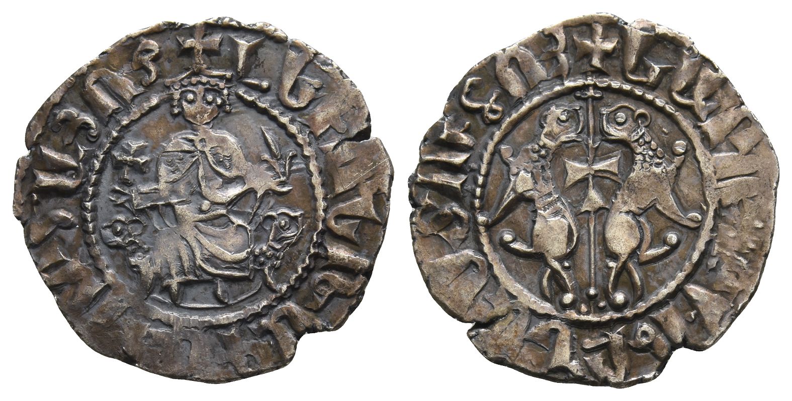 Sis mint. ✠ ԼԵԻՈՆ ԹԱԳԱԻՈՐ ՀԱՅՈՑ ("Levon, king of the Armenians"), Levon seated facing on throne decorated with lions, his feet resting on footstool, wearing royal mantle on his shoulders, holding globus cruciger in his right hand and lis-tipped sceptre in his left / ✠ ԿԱՐՈՂՈՒԹԲՆ ԱՍՏՈԻԾՈՅ ("By the will of God"), two lions rampant back-to-back, each with heads reverted; patriarchal cross between. CCA 123ff. 2.74gr, 22mm, 2h.