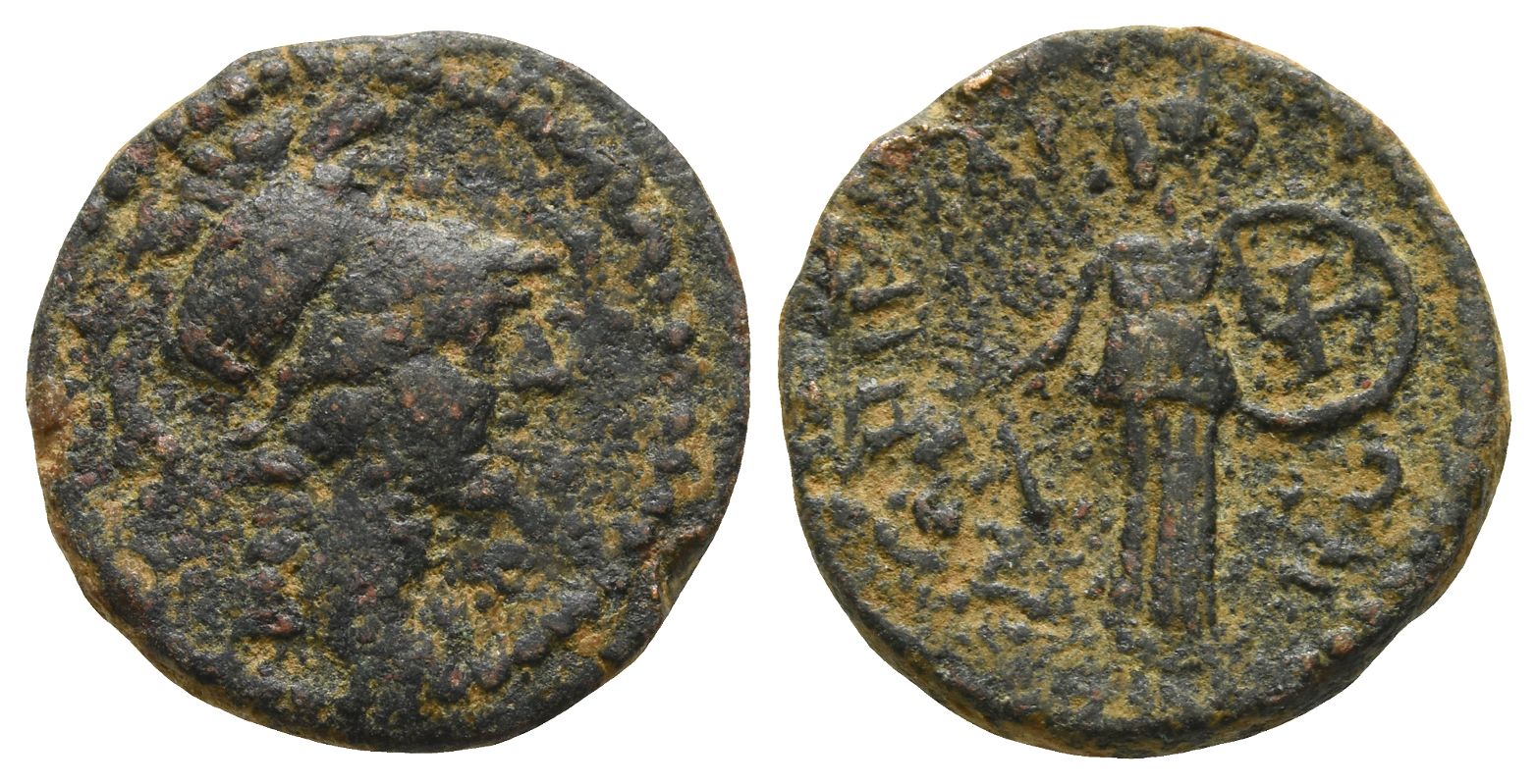 Pseudo-autonomous issue. Head of Athena to right, wearing crested Corinthian helmet / AΘHNAIΩN, Athena standing facing, head to left, holding spear in her right hand and shield in her left. Cf. Kroll 318; cf. Svoronos pl. 86. 6.17gr, 21mm, 3h