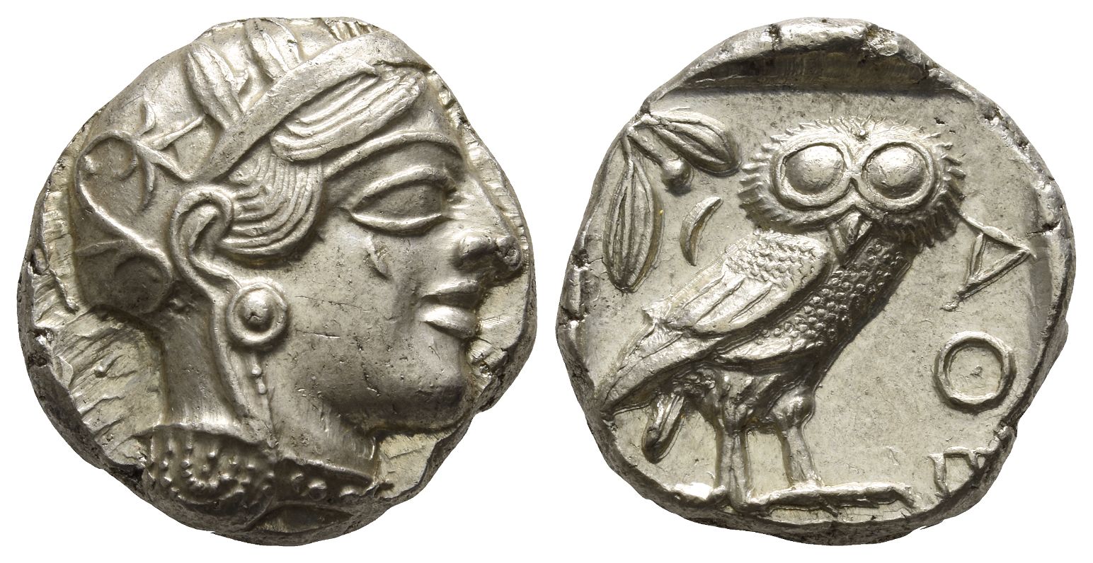 Head of Athena with profile eye to right, wearing disc earring, pearl necklace and a crested Attic helmet adorned with three olive leaves and a pi-style palmette / ΑΘΕ, owl standing to right, head facing the viewer, olive sprig with berry and crescent moon in upper left field, all within incuse square. Kroll 8; Dewing 1591-8; SNG Copenhagen 31; HGC 4, 1597. 17.19gr, 24mm, 4h.