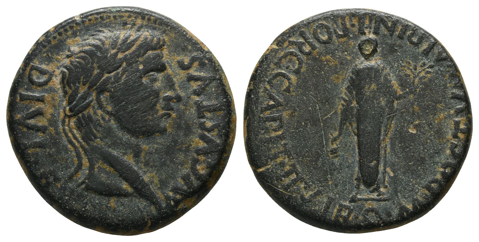 M. Postumus Albinus and L. Porcius Capito, duoviri. AVGVSTVS DIVI • F, laureate head to right / M • POSTVM • ALBIN • L • PORC • CAPIT • II • VIR • Q, priest standing facing, holding simpulum and branch. RPC I 170; ACIP 3140. 13.32gr, 27mm, 10h.