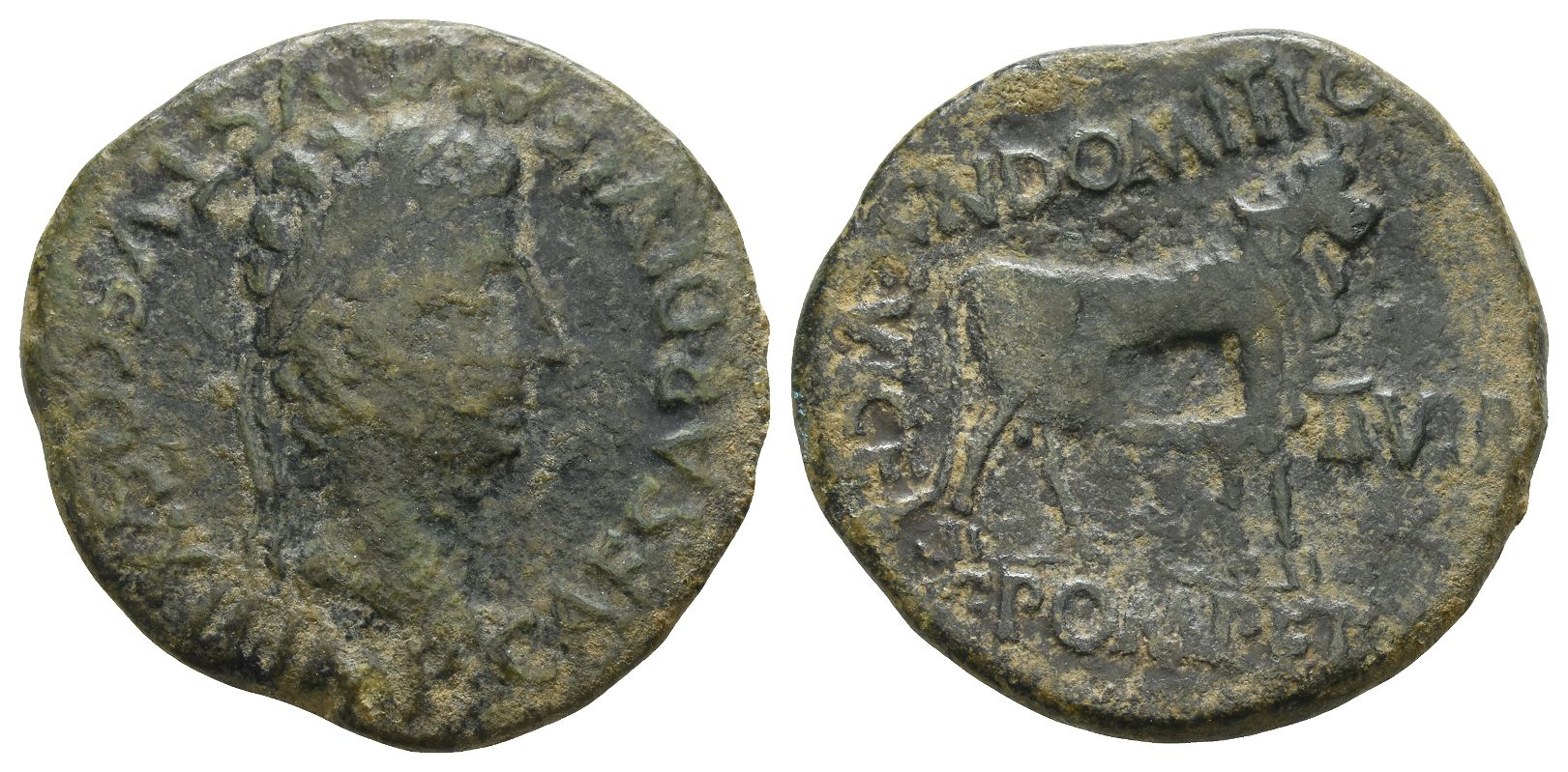 Gaius Pompeius and Gnaeus Domitius, duoviri. Struck circa 5-3 BC. IMP CAESAR • DIVI F AVGVSTVS COS XII, laureate head to right / C V I CEL CN DOMITIO C POMPEIO II VIR, bull standing to right. RPC I, 278. 9.83gr, 29mm, 6h.