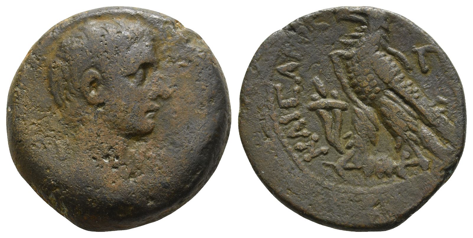 First series. Struck circa 30-28 BC. [ΘΕΟΥ ΥΙΟΥ], bare head of Augustus to right / ΚΑΙΣΑΡΟΣ [ΑΥΤΟΚΡΑΤΟΡΟΣ], eagle with wings closed standing to left on thunderbolt; to left, cornucopia; to right, Π (mark of value). RPC I 5001; Dattari (Savio) 2; Geissen 1; K&G 2.5. 20.03gr, 27mm, 12h.