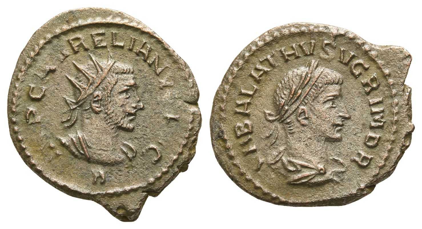 IMP C AVRELIANVS AVG, radiate and cuirassed bust of Aurelian to right; B below / VABALATHVS V C R IM D R, laureate, diademed, draped and cuirassed bust of Vabalathus to right. RIC V.1 381 corr. (reverse bust type). 3.57gr, 20mm, 4h.