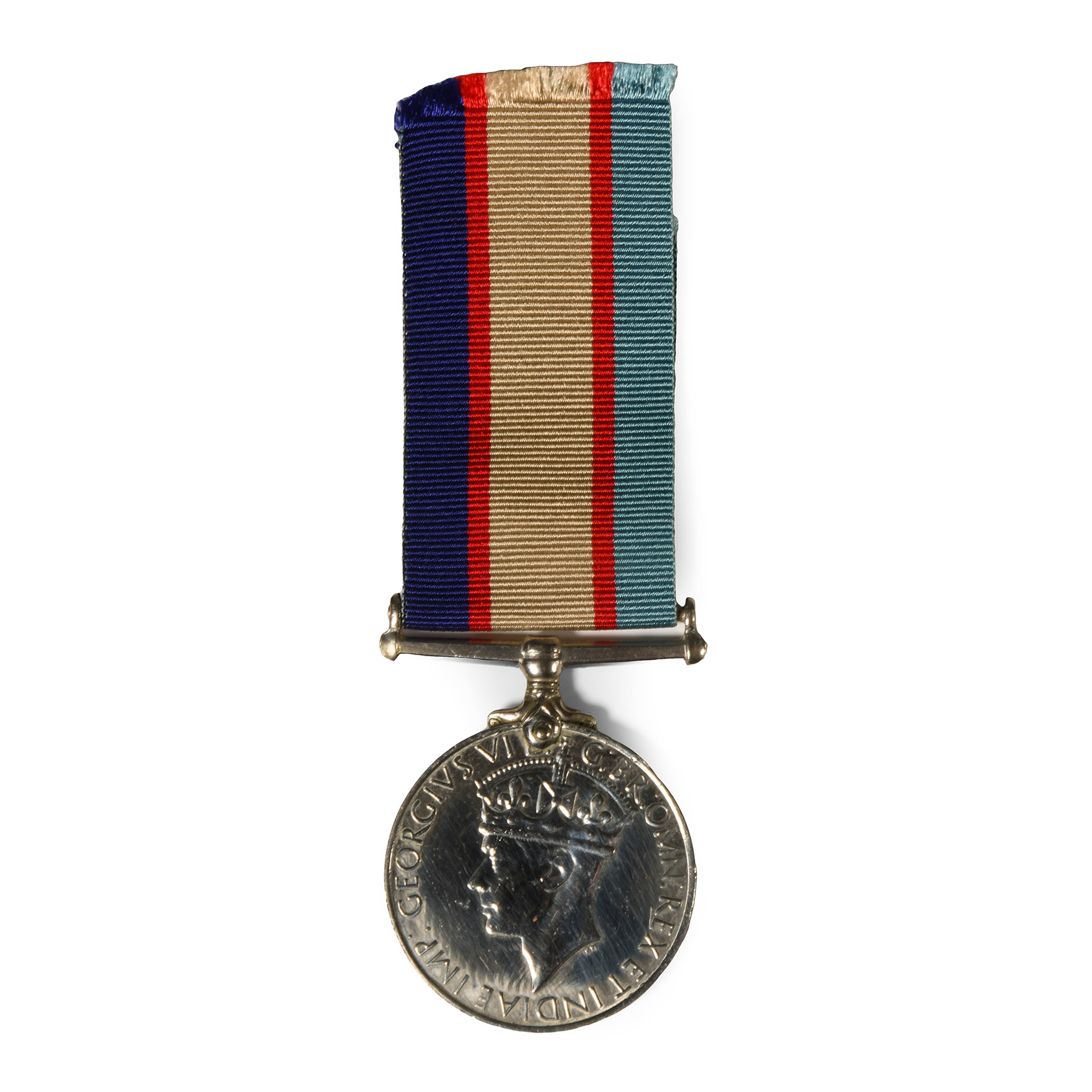 The Medal is circular and made of cupro-nickel and measures 36 millimetres (1.4 inches) in diameter and has the recipient’s name is impressed on the rim: 'VX58241 K. G. THORSEN. Crowned effigy of King George VI and surrounded by the inscription ‘GEORGIVS VI D:G:BR:OMN:REX ET INDIAE IMP‘ / Coat of arms of the Commonwealth of Australia surrounded by the words ‘THE AUSTRALIA SERVICE MEDAL 1939-1945’, the ribbon measures 32 millimetres (1.3 inches) wide and has a wide khaki central stripe (represents the Army), flanked by two narrow red stripes, the edge stripes are dark blue on the left and light blue on the right (representing the Mercantile Marine, Navy, and Air Force respectively). 32.74gr, 36mm