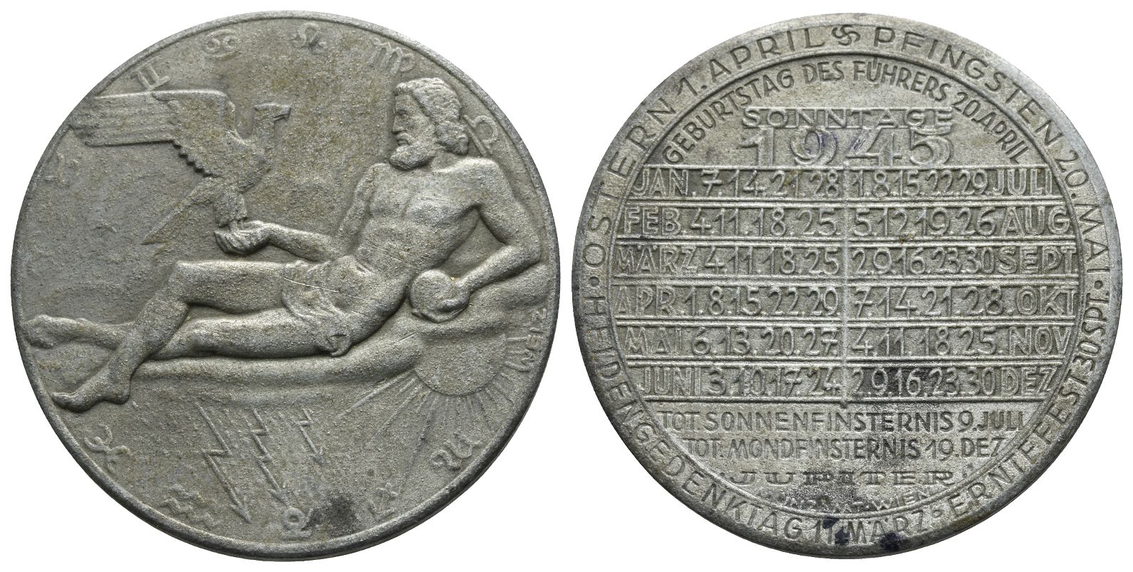 Design by Welz. Jupiter reclining to left with legs crossed, holding eagle with wings spread to right with his right hand and globe with his left; comet star in left field, sun and thunderbolts below; around, the twelve signs of the Zodiac / Calendar with Sundays of 1945. Strothotte 1945-3. 17.29gr, 40mm, 12h.