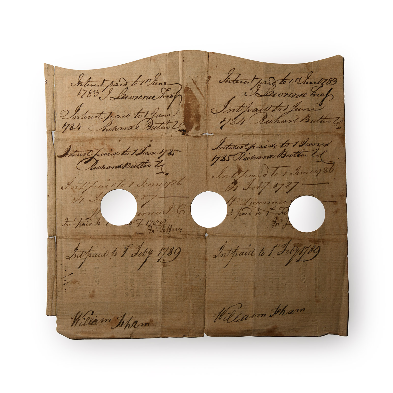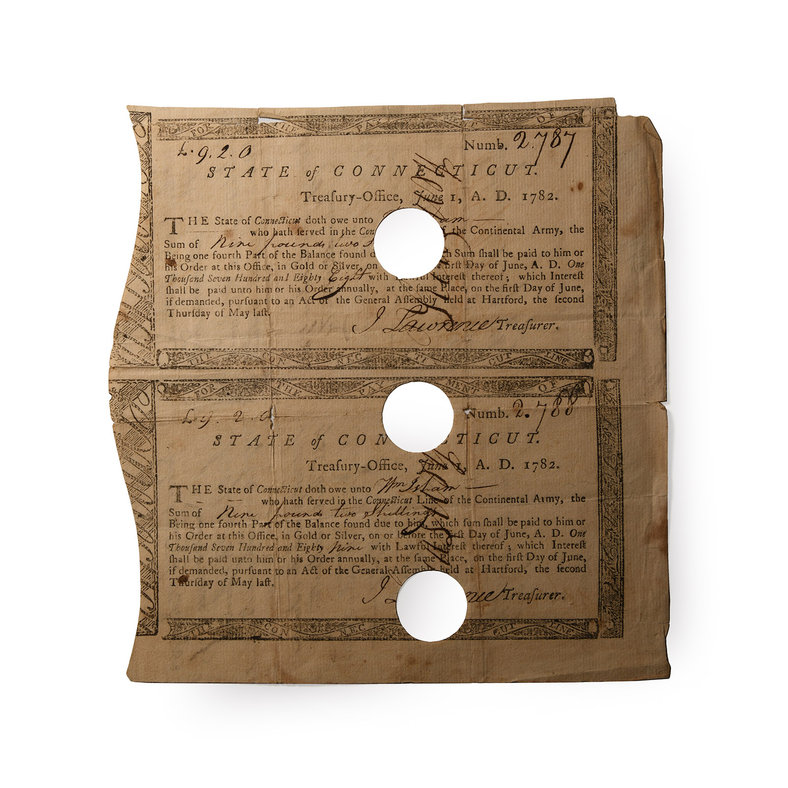 Numbered 2787 and 2788, in favour of William Isham, having served in the Connecticut Line of the Continental Army, each for the inked sum of Nine Pounds Two Shillings, signed by J Lawrence, Treasurer and redeemable 1789, with interest payable annually; the reverse with ink endorsements confirming payment of interest each year from 1783 to 1789, with signatures of the treasurers each year, including J. Lawrence, Richard Butler and Jonathon Jeffrey and signed also by the recipient; triple holed to cancel. 10 grams, 20.8 x 20 cm.