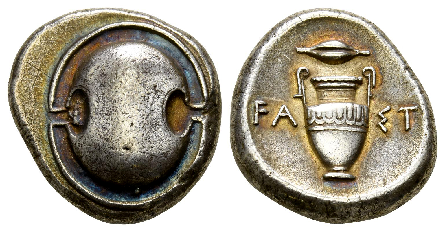 Wast(ias), magistrate. Boiotian shield / Volute krater with a decorated upper half, barley grain above, FA-ΣT across central field; all within shallow incuse circle. Hepworth 36; BCD Boiotia 494; BMC 120; HGC 4, 1330. 12.14gr, 22mm, 2h