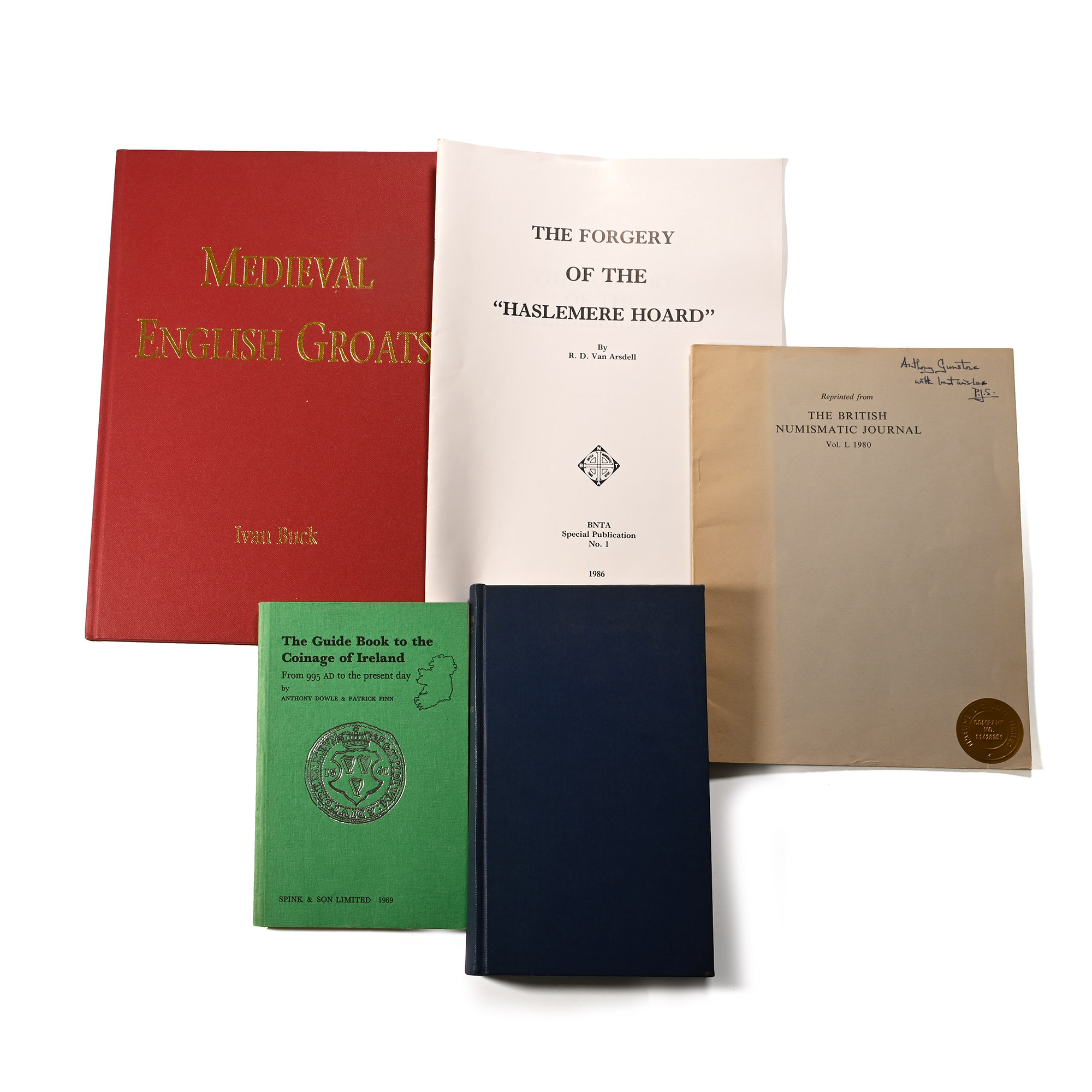 Ivan Buck - Medieval English Groats - Witham, 2000, hardback, cloth covers, gold titling, 66 pp, colour, No. 13 in a limited edition of 20, signed by the author; P. Seaby - King Stephen and the Interdict of 18 - Reprint from the British Numismatic Journal, London, 1980, card covers, 10pp; R.D. van Arsdell - The Forgety of the "Haslemere Hoard - BNTA Special Publication No.1, London, 1986, card covers, 14 pp, monochrome; H. Montagu - The Copper, Tin and Bronze Patterns for Coins - London, 1893 reprinted, hardback with cloth cover, gold titling, 149 pp, monochrome; A. Dowle & P. Finn - The Guide Book to the Coins of Ireland - London, 1969, card covers, 127 pp, monochrome. 1.35 kg total, 18.5 x 12 - 30.5 x 21.5 cm