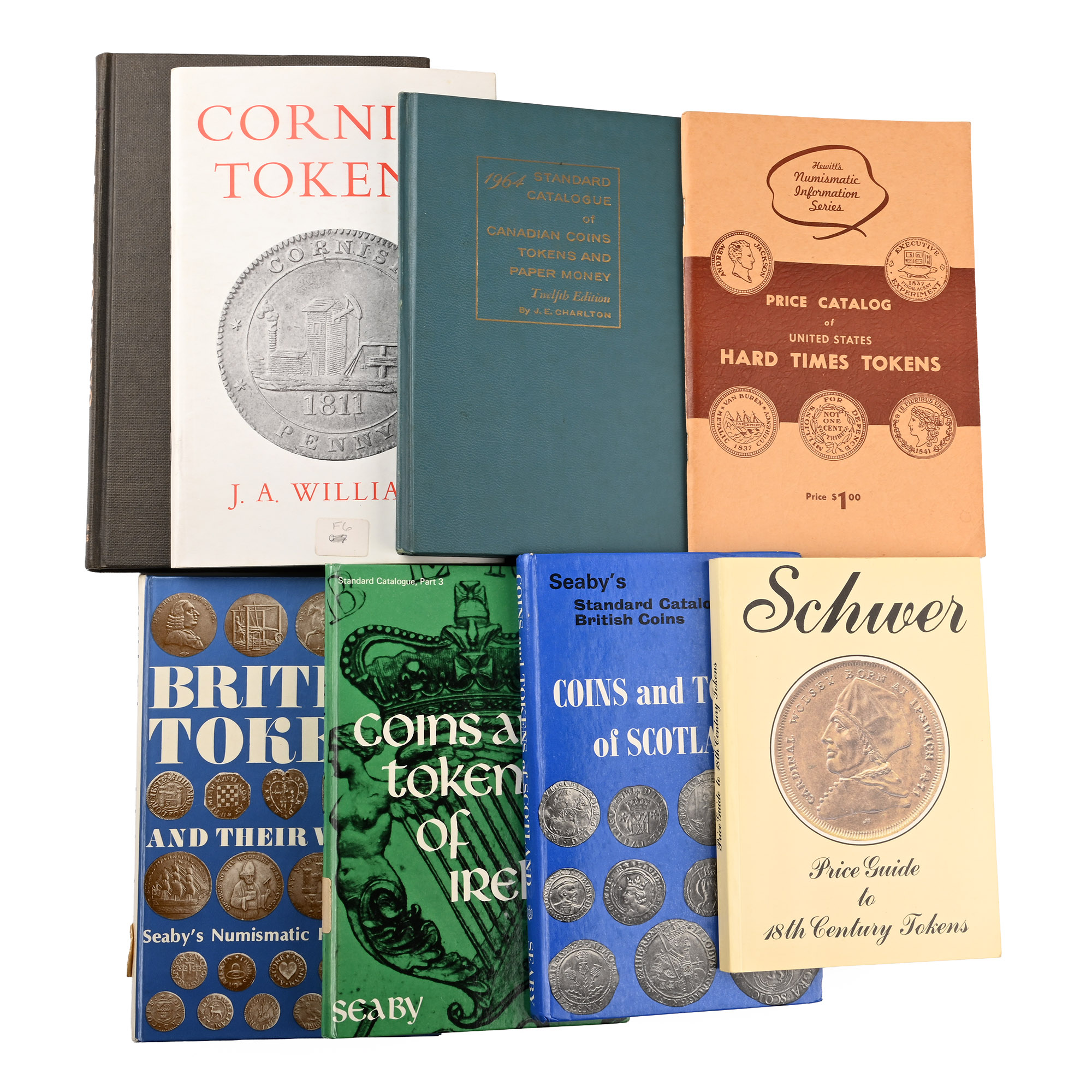 J.R.S. Whiting - Trade Tokens - Newton Abbot, 1971, hardback with cloth covers, 192 pp, monochrome plates; J.A. Williams - Cornish Tokens - St.Austell, n.d., card covers, 48 pp, monochrome; J.E. Charlton - Standard Catalogue of canadian Coins, Tokens and Paper Money - 12th edition, Toronto, 1964, hardback with cloth covers,126 pp, monochrome; Hewitt's Price Catalog of United States Hard TImes Tokens - Chicago, n.d., card covers, 60 pp, line drawings; P. Seaby & M. Russell - British Tokens and Their Values - London, 1970, hardback,199 pp, monochrome; P. Seaby - Coins and Tokens of Ireland - London, 1970, hardback, 168 pp, monochrome; P. Seaby - Coins and Tokens of Scotland, London, 1972, hardback, 159 pp, monochrome; S.E. Schwer - Price Guide to 18th Century Tokens - Woodbridge, 1967, card covers, 182 pp, monochrome. 1.88 kg total, 17.1 x 12 - 22.4 x 14.3 cm