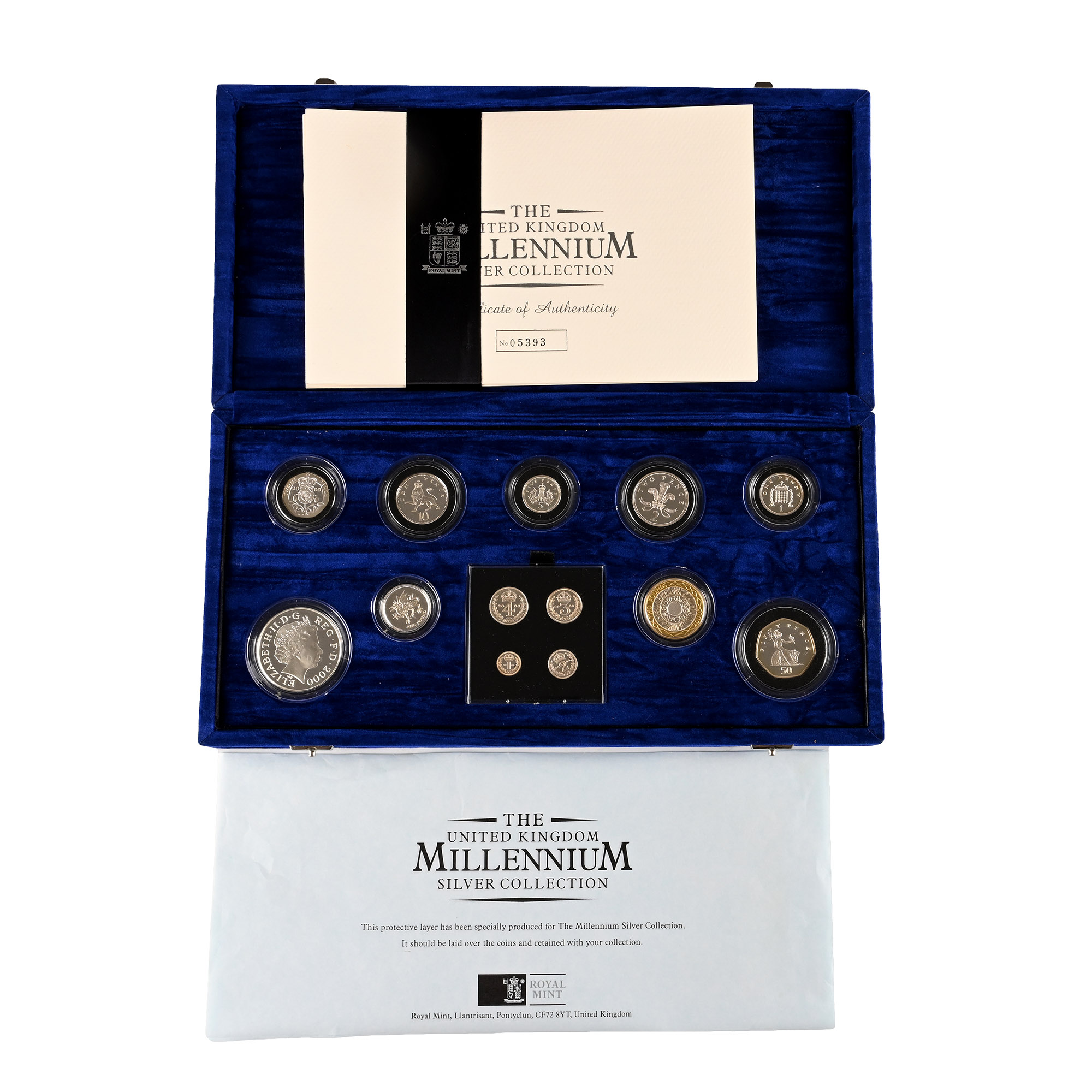 All of the coins are struck in .925 sterling silver with a fine proof finish. Original certificate of authenticity included (No 05393). 2000 Millennium £5 Crown Silver Proof.