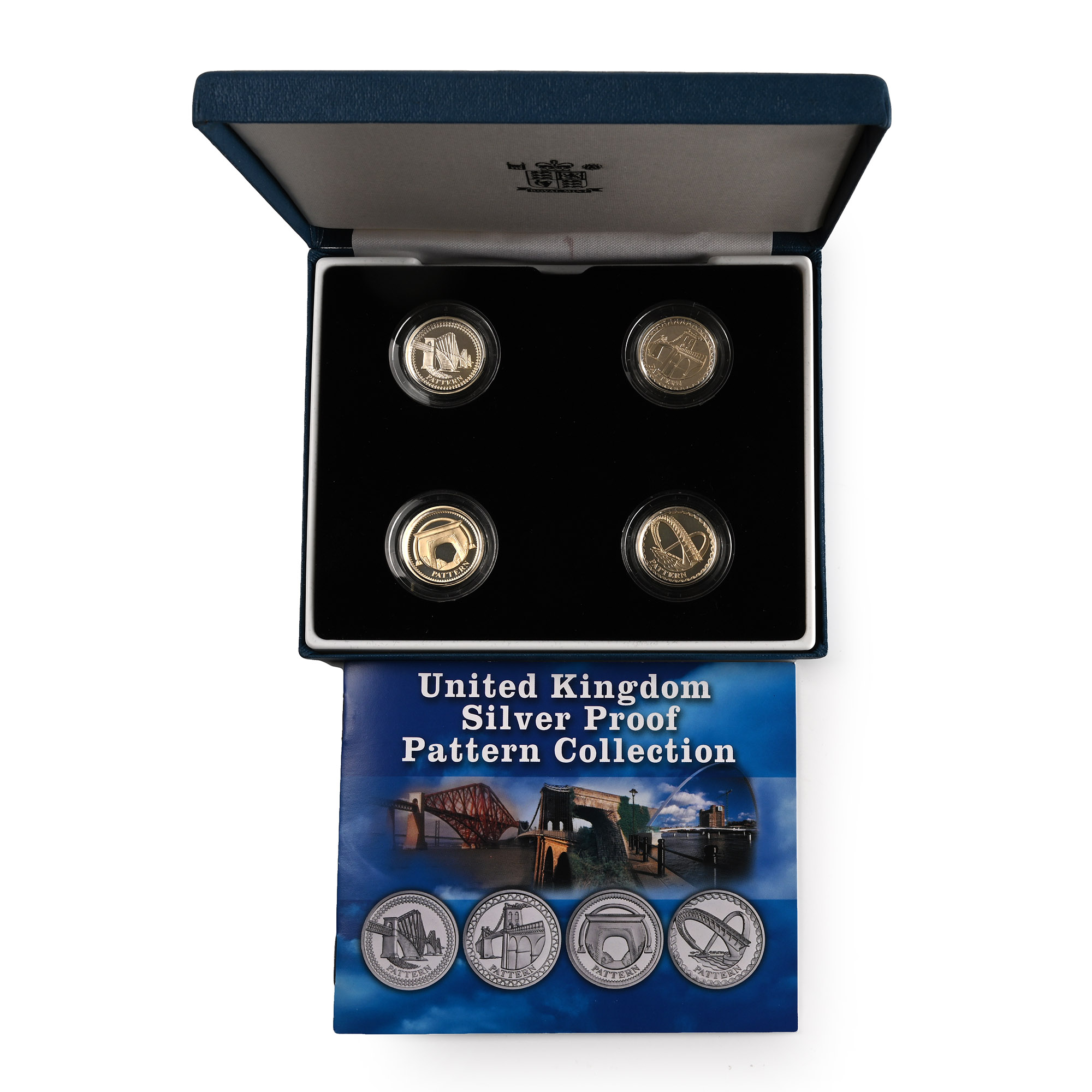 A series of four pattern £1 coin designs by Edwina Ellis, representing England, Scotland, Wales and Northern Ireland. Struck in sterling silver, 0.925 fineness, this pattern proof coin set comes in a presentation box with certificate. 274gr total.