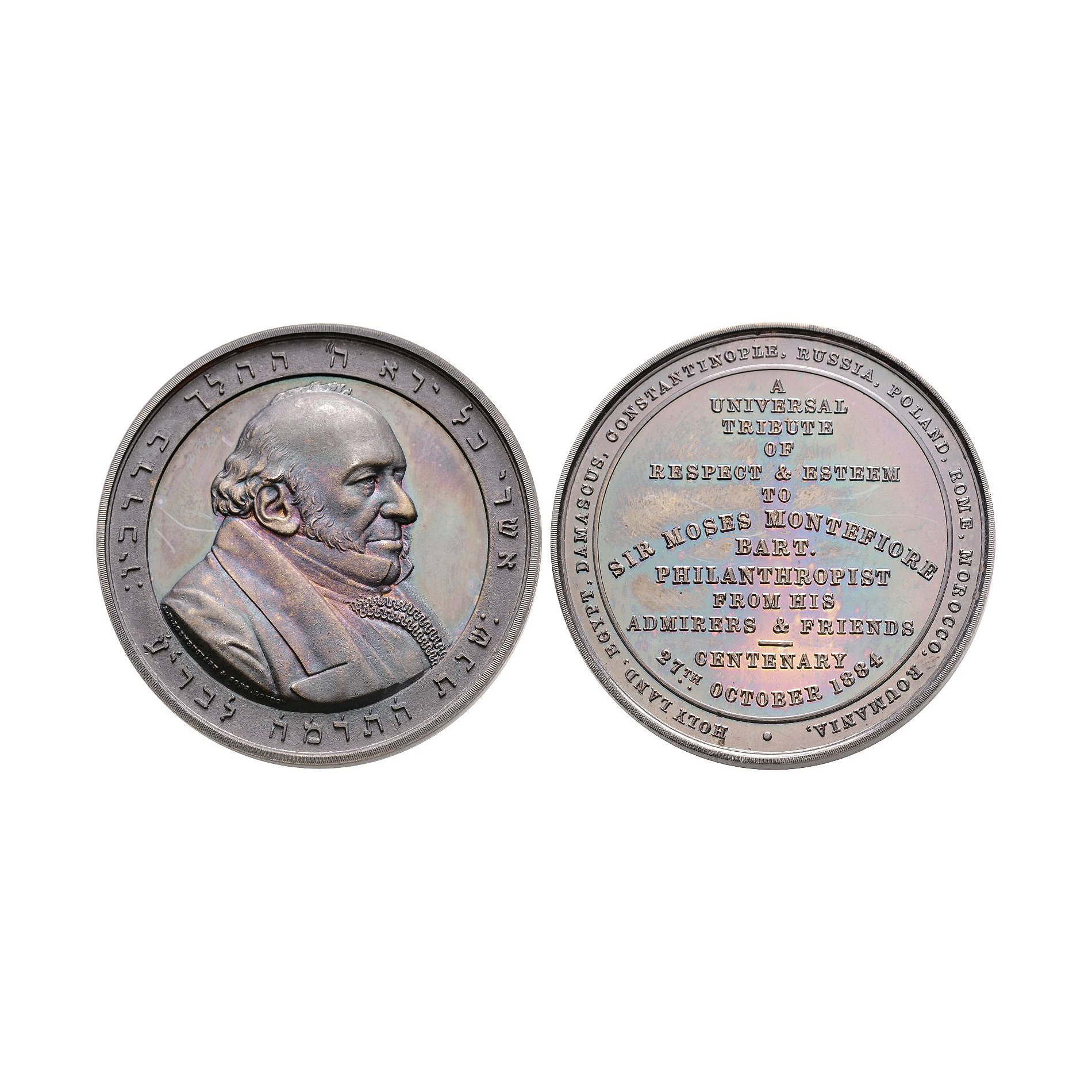 Silver medallion by Loewenstark & Sons, London. Obv: profile bust with Hebrew legend and date. Rev: A / UNIVERSAL / TRIBUTE / OF / RESPECT & ESTEEM / TO / SIR MOSES MONTEFIORE / BART / PHILANTHROPIST / FROM HIS / ADMIRERS & FRIENDS / CENTENARY / 27TH OCTOBER 1884 in 13 lines with HOLY LAND EGYPT DAMASCUS CONSTANTINOPLE RUSSIA POLAND ROME MOROCCO ROUMANIA legend. 33.02 grams, 41mm.