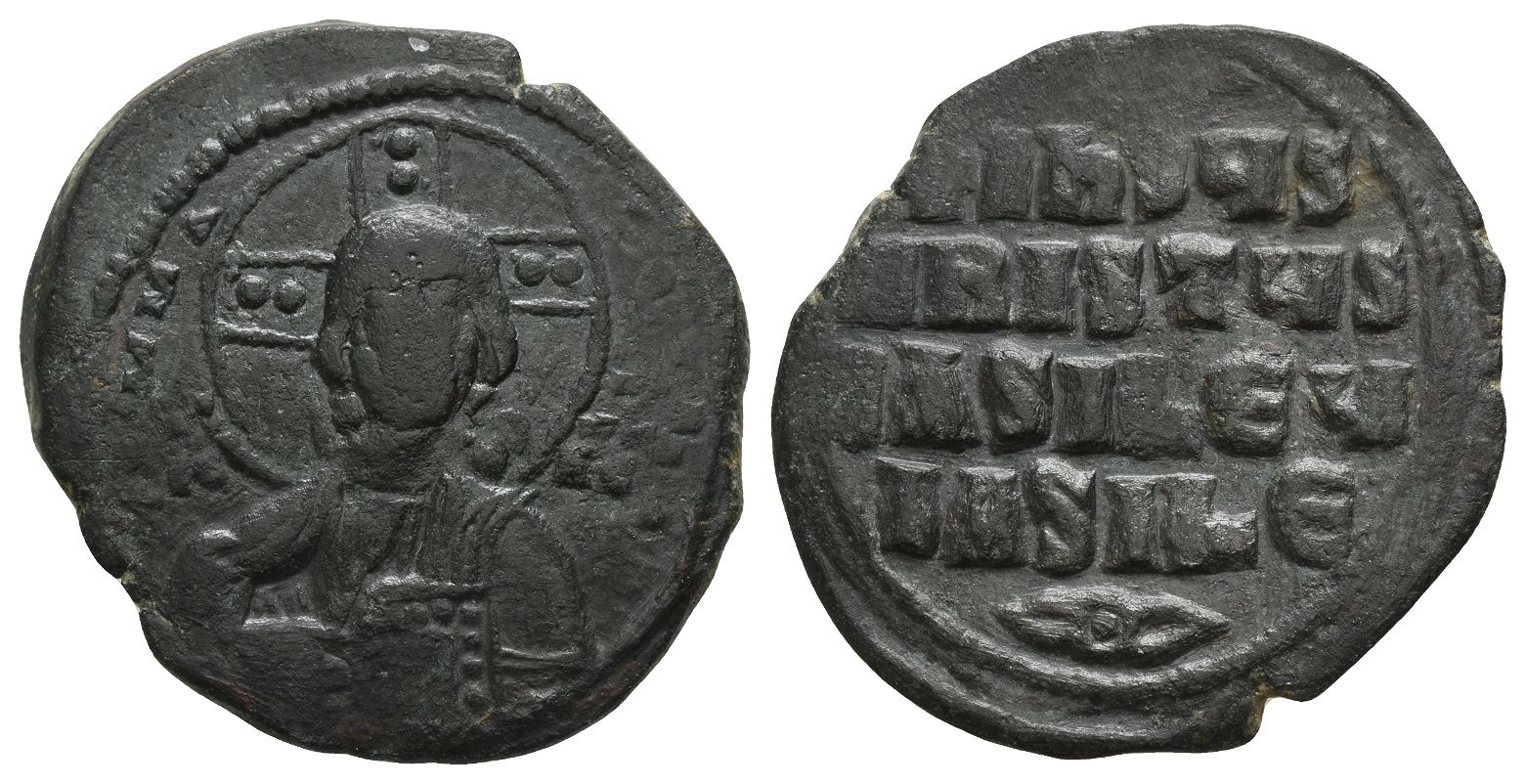 Constantinople mint. Class A2. [✠ Є]MMA-[NOVHΛ], nimbate bust of Christ Pantokrator facing, wearing tunic and himation, raising right hand in benediction and holding Book of Gospels in His left; two dots in each limb of the nimbate cross; IC XC in fields / ✠ IҺSЧS XRISTЧS ЬASILЄЧ ЬASILЄ, legend in four lines across field; ornament above and below. DOC A2.40 or 51; SB 1818 (Class A3). 9.22gr, 30mm, 6h.
