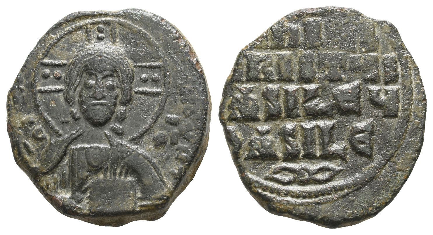 ✠ ЄMMA-NOVHΛ, nimbate bust of Christ Pantokrator facing, wearing tunic and himation, raising right hand in benediction and holding Book of Gospels in His left; in each limb of the nimbate cross two dots; IC XC in fields / ✠ IҺSЧS XRISTЧS ЬASILЄЧ ЬASILЄ, legend in four lines across field; ornament above and below. DOC A2; SB 1818 (Class A3). 9.23gr, 26mm, 6h.