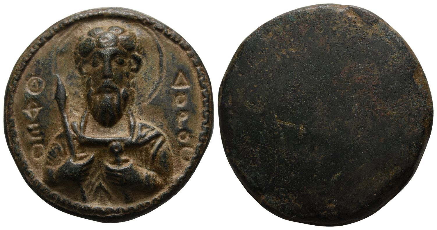 Ο Α ΘΕΟ-ΔΟΡΟC(sic), facing bust of Saint Theodore, nimbate, holding spear with right hand and sword with left / Blank. 74gr, 47mm.