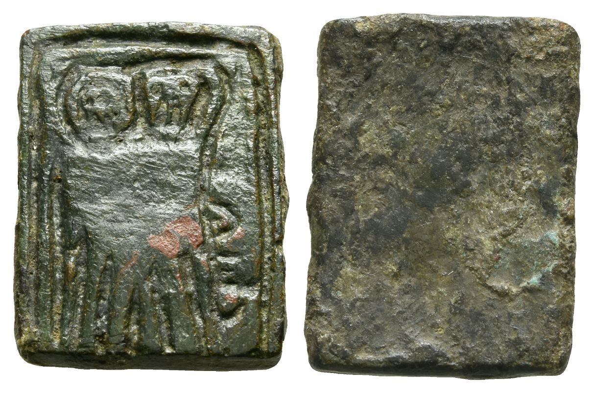 Rectangular flat-section weight with low-relief motif of a standing two-headed figure / Blank. 5.17gr, 20mm.