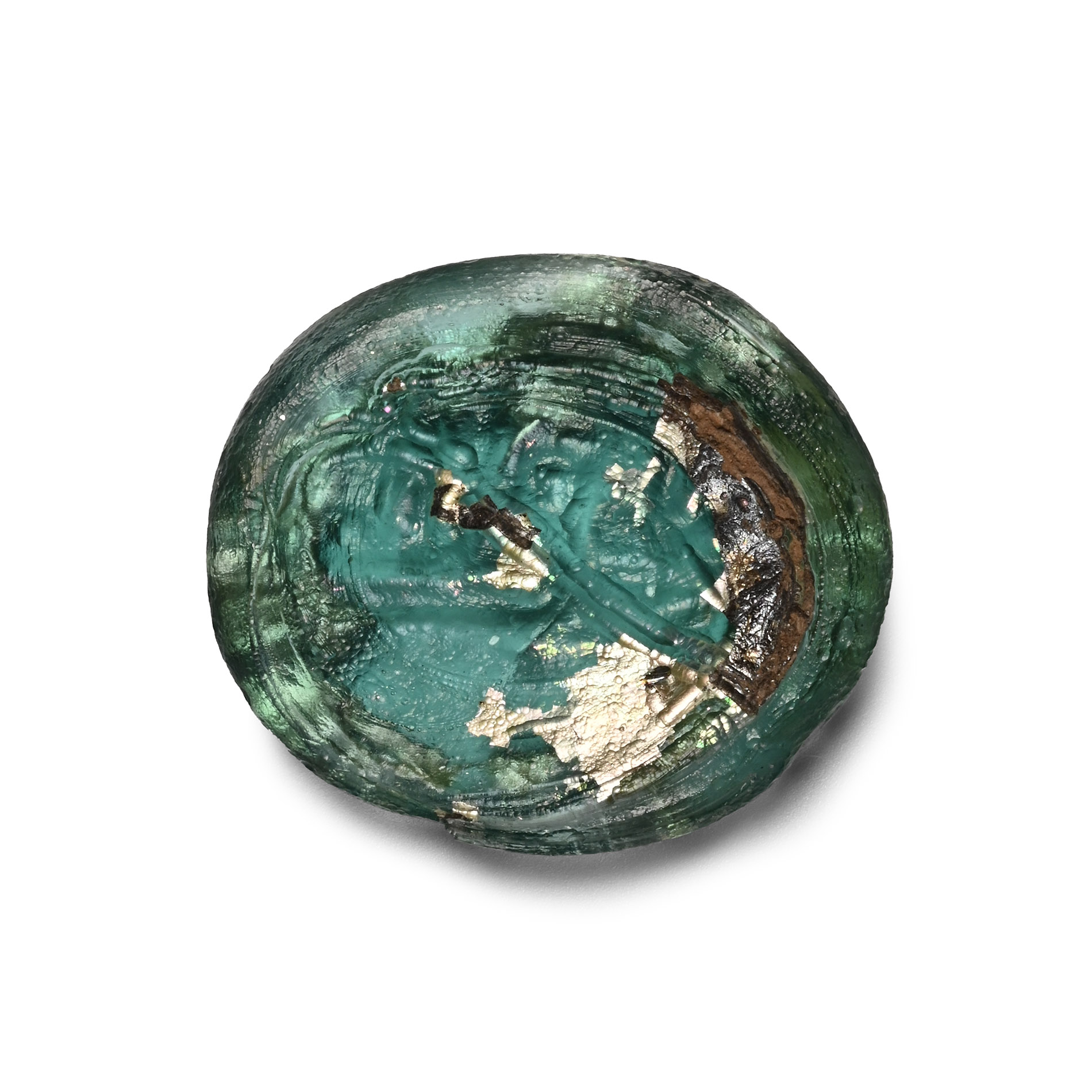 Condition as seen. Green glass discoid weight with traces of silvering.