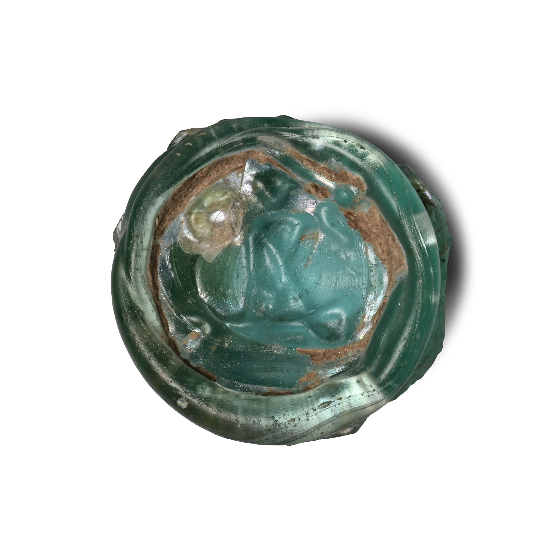 Condition as seen. Green glass discoid weight with convex reverse. Traces of silvering.