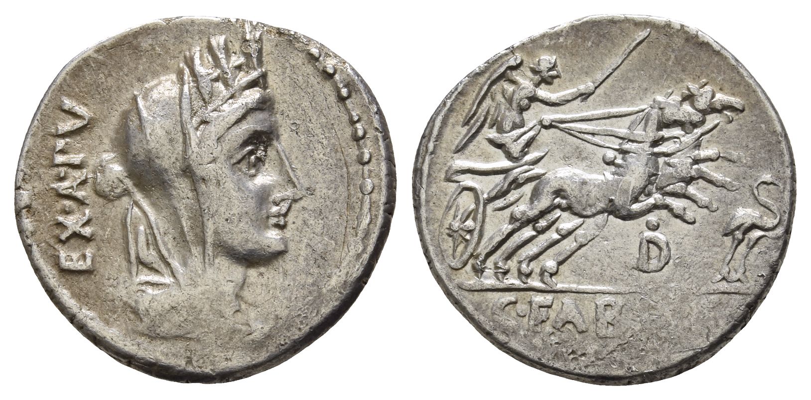 Turreted and veiled head of Cybele to right, wearing single-drop earring and pearl necklace; EX•A•PV (EX Avctoritate PVblica) upwards to left / Victory driving galloping biga to right, holding reins in left hand and goad in right; • over D beneath horses, and stork standing to right; C•FAB[I•C•F] in exergue. Crawford 322/1b; RSC Fabia 14. 3.84gr, 20mm, 1h.