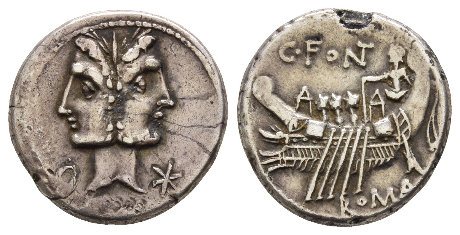 Laureate, janiform heads of the Dioscuri; O to left and mark of value to right, five pellets below / Galley to left with three rowers, gubernator at stern; C•FONT (NT ligate) above, ROMA below. Crawford 290/1; BMCRR Italy 608; RSC Fonteia 1. 3.87gr, 19mm, 4h.