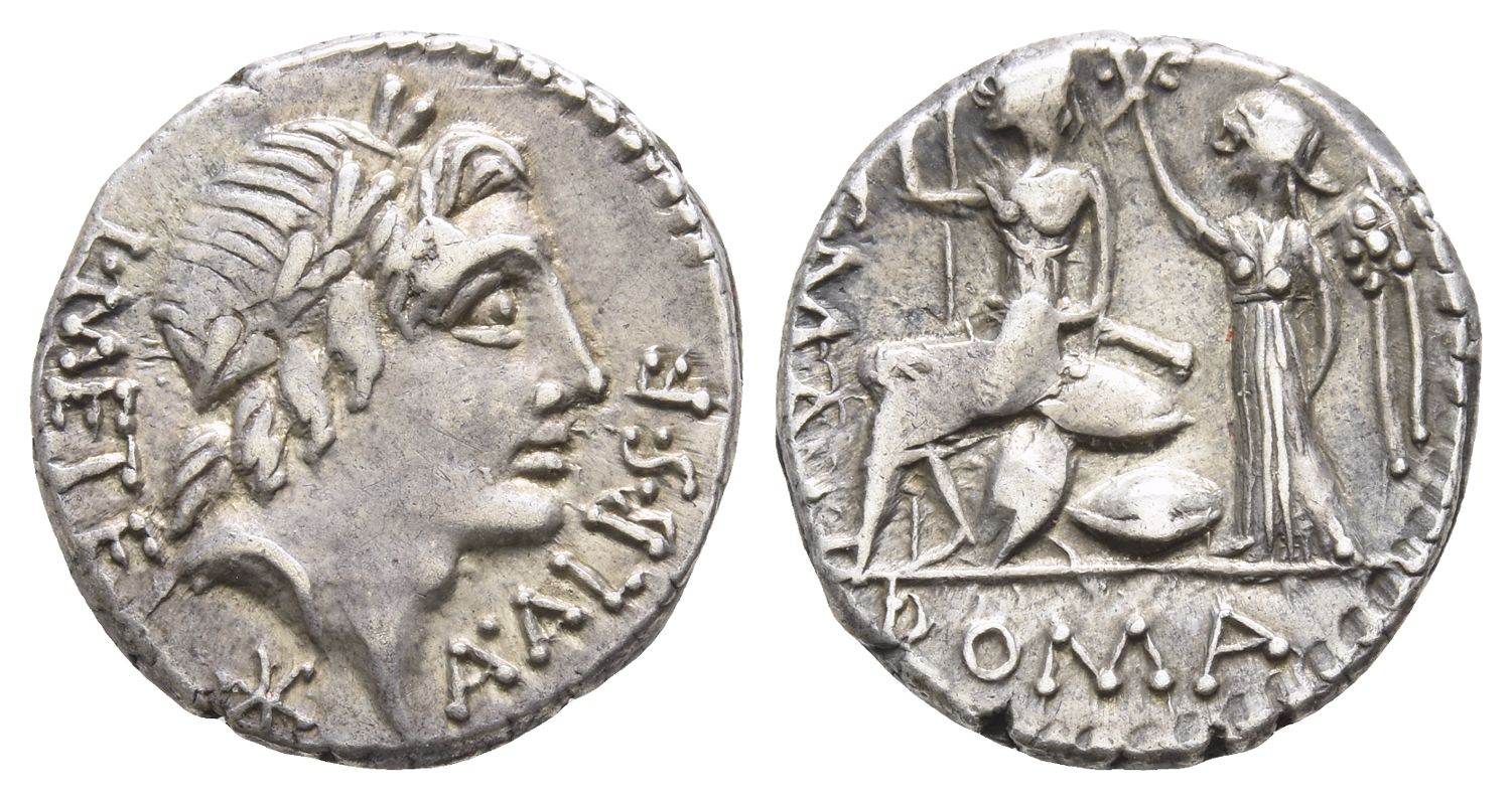 Laureate head of Apollo to right; star below, A • ALB • S • F upwards before, L • METEL downwards behind / Roma seated to left on pile of shields, holding sword and spear, being crowned by Victory standing behind; C • MALL downwards in left field, ROMA in exergue. Crawford 335/1b; BMCRR Italy 730; RSC Poblicia 3, Postumia 3 and Caecilia 45; RBW 1201. 3.92gr, 18mm, 6h.