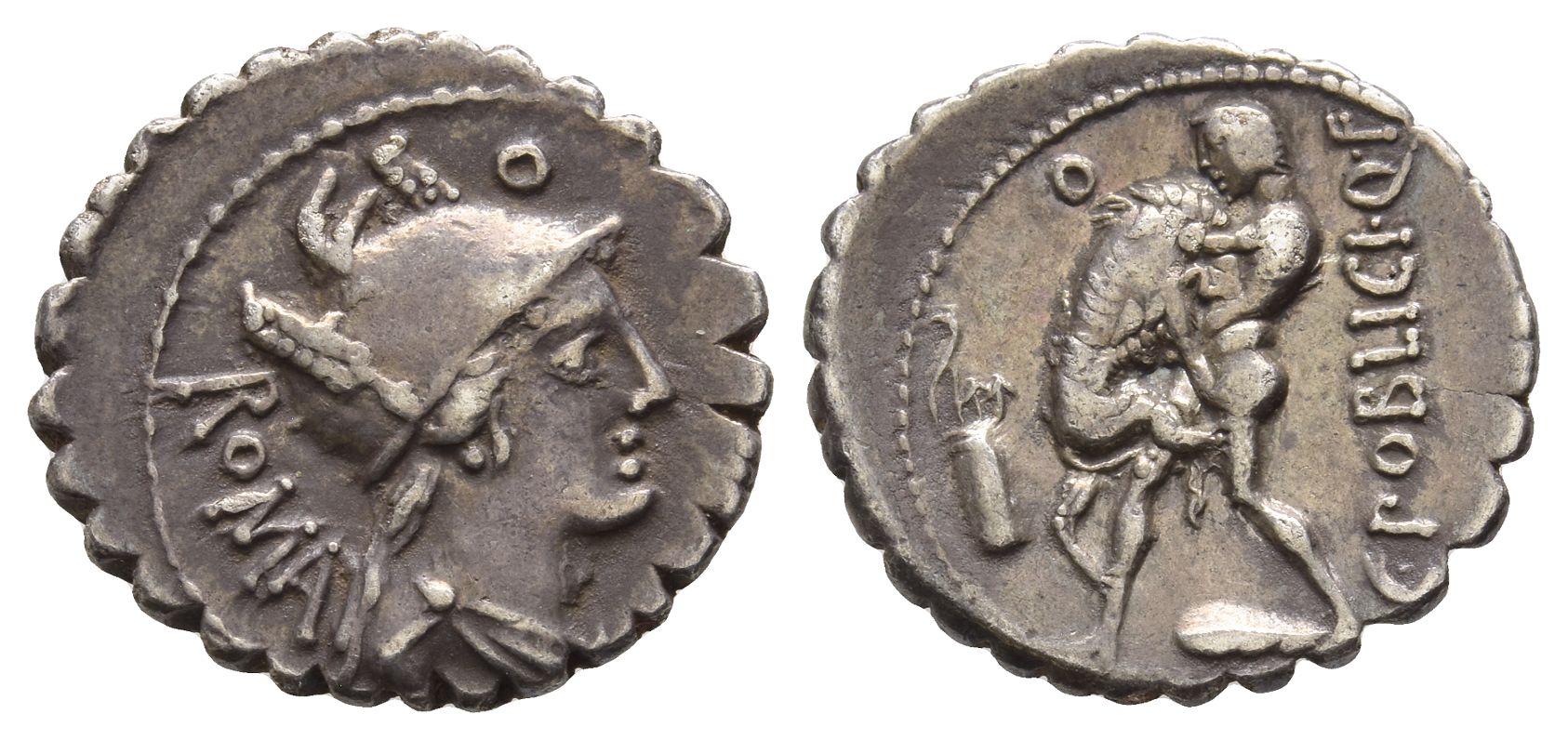 Helmeted and draped bust of Roma to right; O (control letter) above, ROMA downwards behind / Hercules standing to left, strangling the Nemean lion; club at feet, bow and arrows in bow-case on lower left, O (control letter) on upper left, C•POBLICI•Q•F upwards on right. Crawford 380/1; BMCRR Rome 2909; RSC Poblicia 9 corr. (reverse legend). 3.84gr, 20mm, 6h.