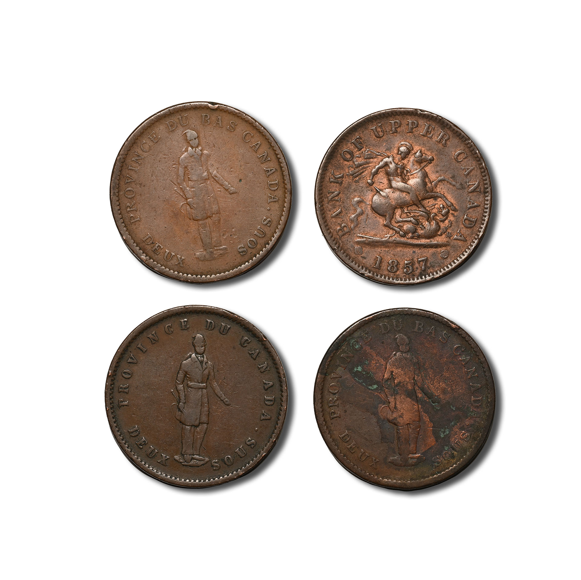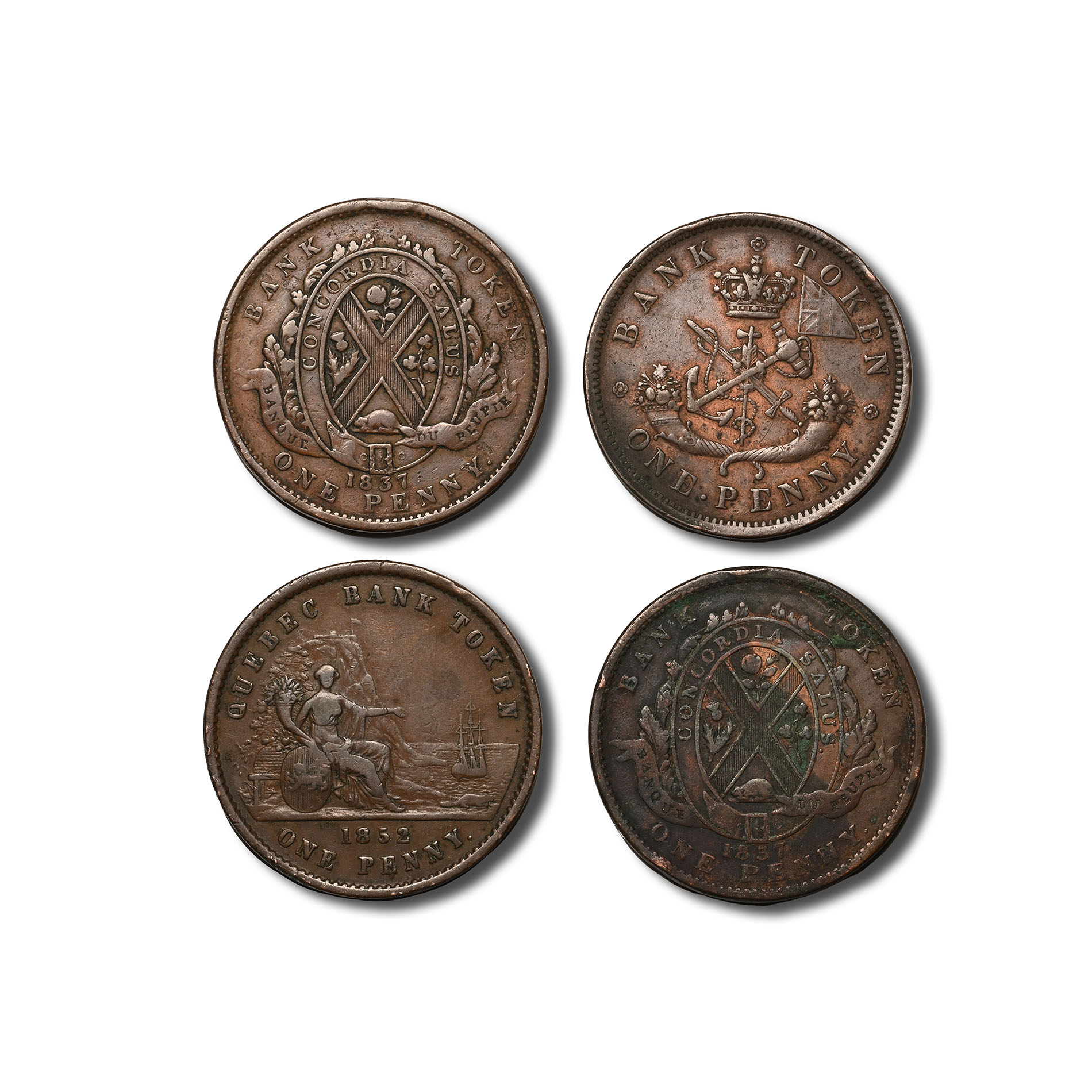 Group comprising: four Canadian copper one Penny bank tokens. 71.15gr total, 33-34mm