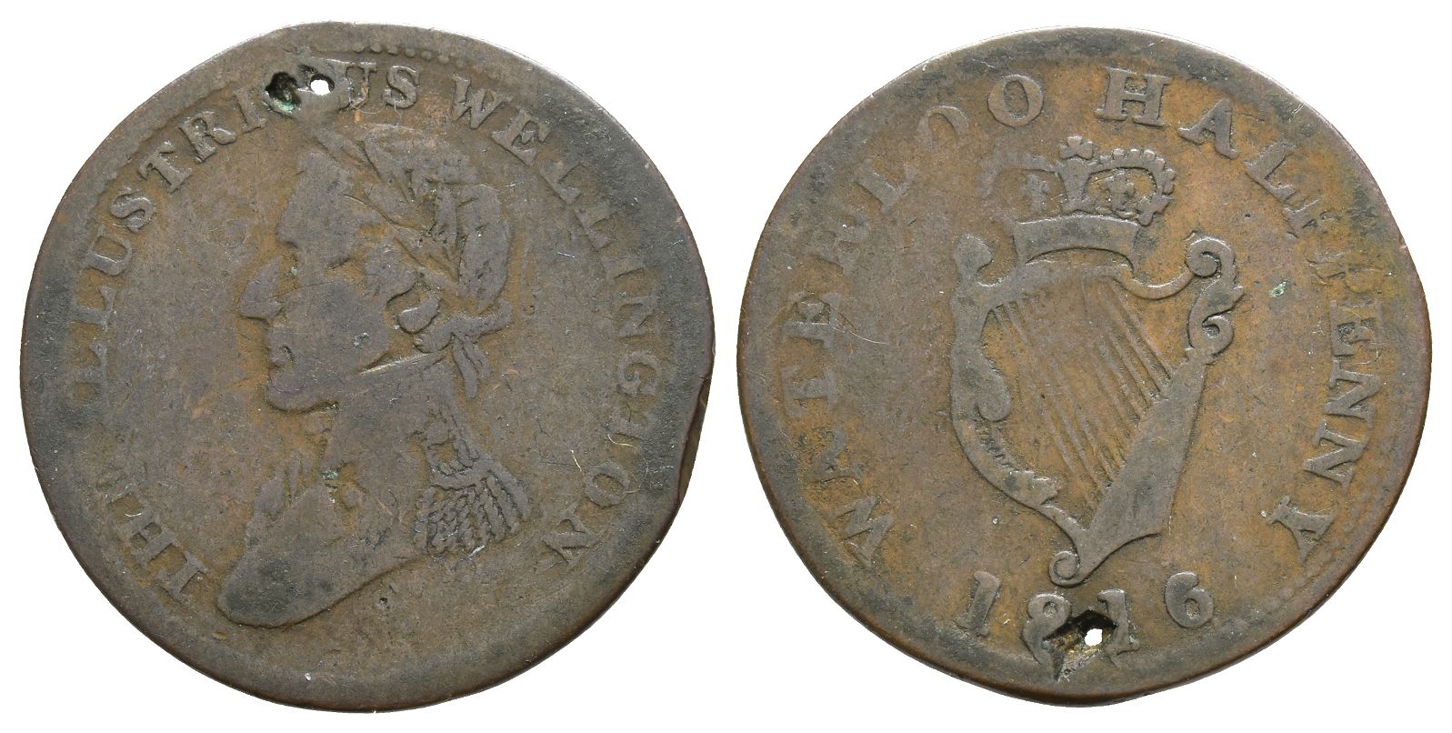 THE ILLUSTRIOUS WELLINGTON, laureate bust to left / WATERLOO HALFPENNY 1816, harp. BR 981; WE 10A1. 4.56gr, 26mm, 6h.