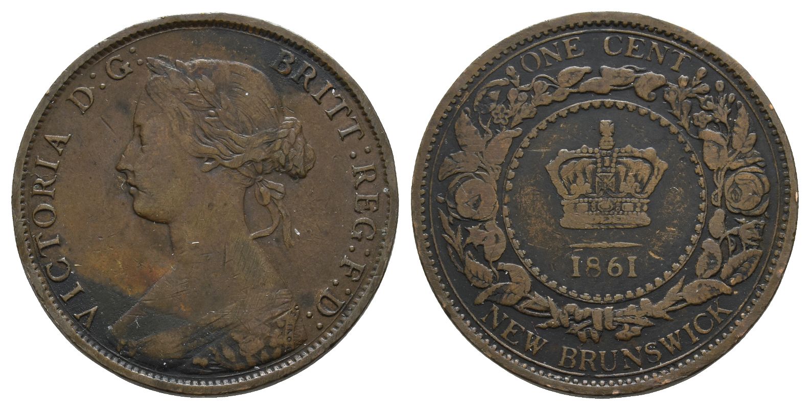 Dated 1861. VICTORIA D: G: BRITT: REG: F D:, laureate and draped bust to left / ONE CENT 1861 NEW BRUNSWICK, crown within border of leaves and flowers. Ch# NB-1. 5.43gr, 25mm, 12h.
