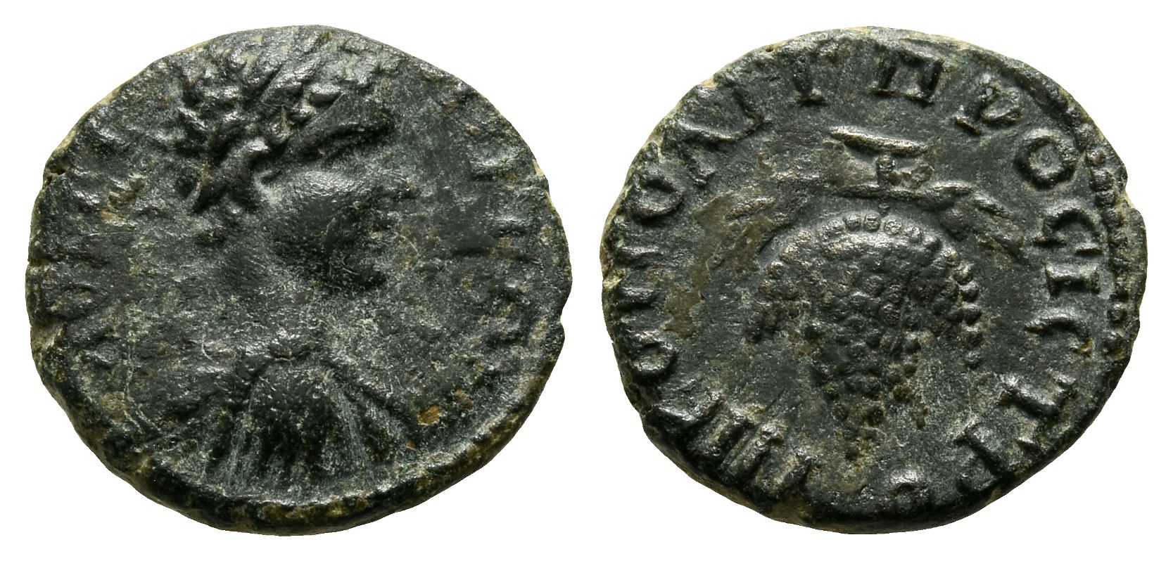 AV KЄC ANTΩN, laureate, draped and cuirassed bust to right / NIKOΠOΛIT ΠPOC ICTPO, bunch of grapes. Varbanov 2949 var. (bust and legends). 2.41gr, 15mm, 6h.