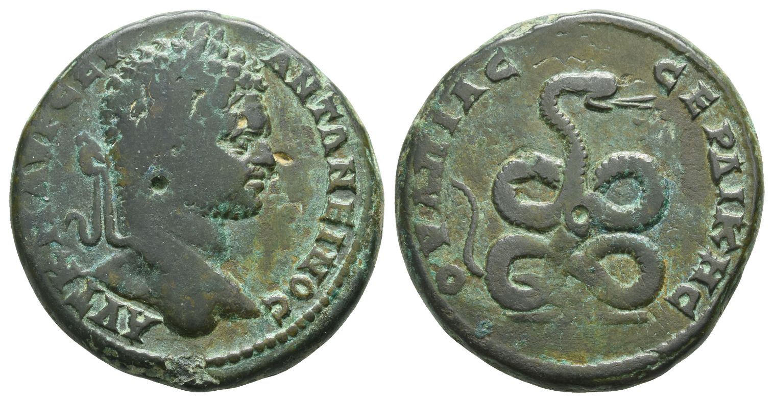 ΑΥΤ Κ Μ ΑΥΡ CΕΥ ΑΝΤΩΝΕΙΝΟC, laureate head to right / ΟΥΛΠΙΑC CΕΡΔΙΚΗC, serpent coiled to right. Varbanov 2443; Ruzicka 355. 17.26gr, 30mm, 7h.