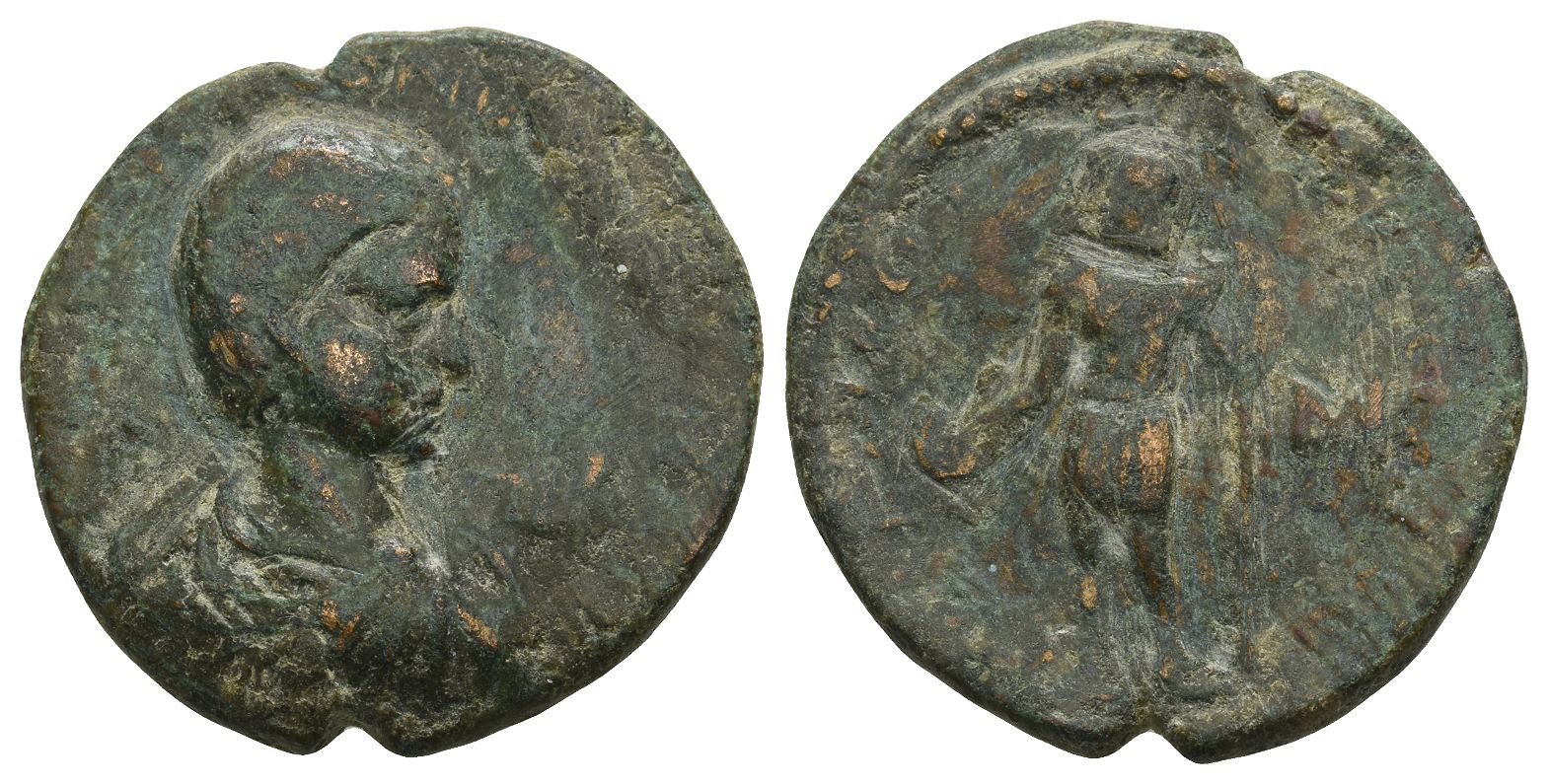 Bare-headed, draped and cuirassed bust to right, seen from rear / Uncertain male deity standing facing, head to left, holding patera(?) with right hand and sceptre with left. 10.56gr, 27mm, 12h.