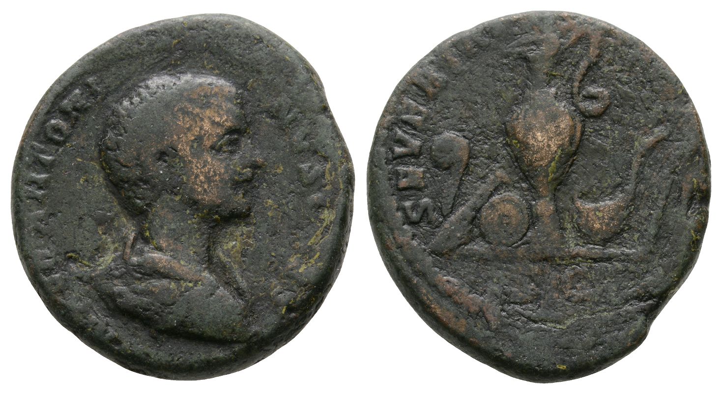 Rome mint; struck AD 196-197. [M AVR] ANTONINVS C[AES], bare-headed and draped bust to right, seen from rear / SEVERI [AVG P II FIL], lituus, knife, patera, jug, simpulum, and sprinkler; S C in exergue. RIC IV 404; Cohen 586; BMCRE 615. 10.75gr, 25mm, 6h