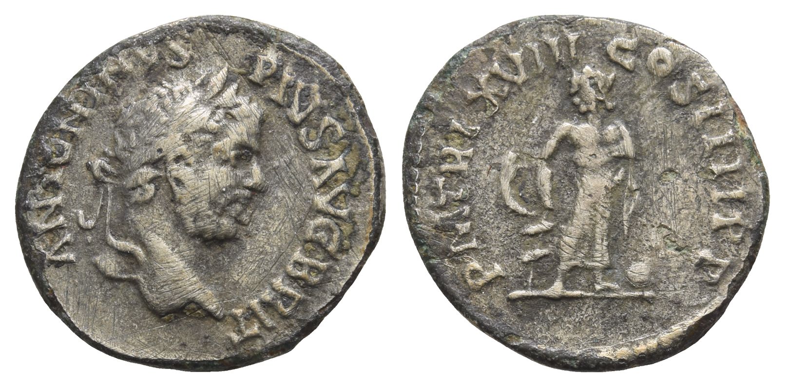 ANTONINVS PIVS AVG BRIT, laureate head to right / P M TR P XVIII COS IIII P P, Aesculapius standing facing, holding serpent-wreathed wand; to his feet to right, globe. RIC IV 327; BMCRE p.384, 157 / pl. 64, 10. 2.47gr, 17mm, 6h.
