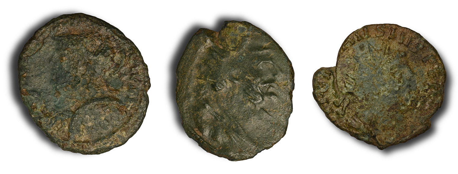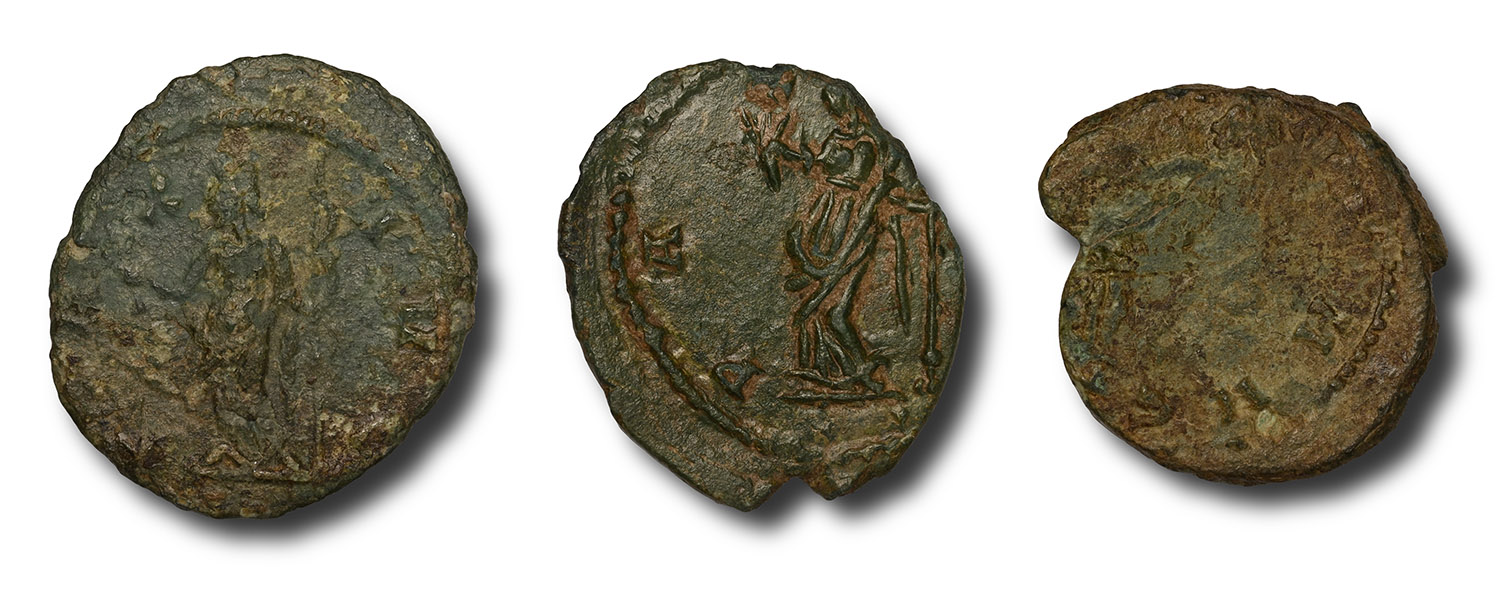 3) Rotomagus(?) mint. [I]MP C[...]AVSIVS P F AVG, laureate, draped, and cuirassed(?) bust to right / [FORTV]NA AVG, Fortuna standing to left, holding rudder and cornucopiae. Cf. RIC V-2, Rotomagus 639; cf. Webb 696. Scarce type. 7.23gr total, 19-21 mm.