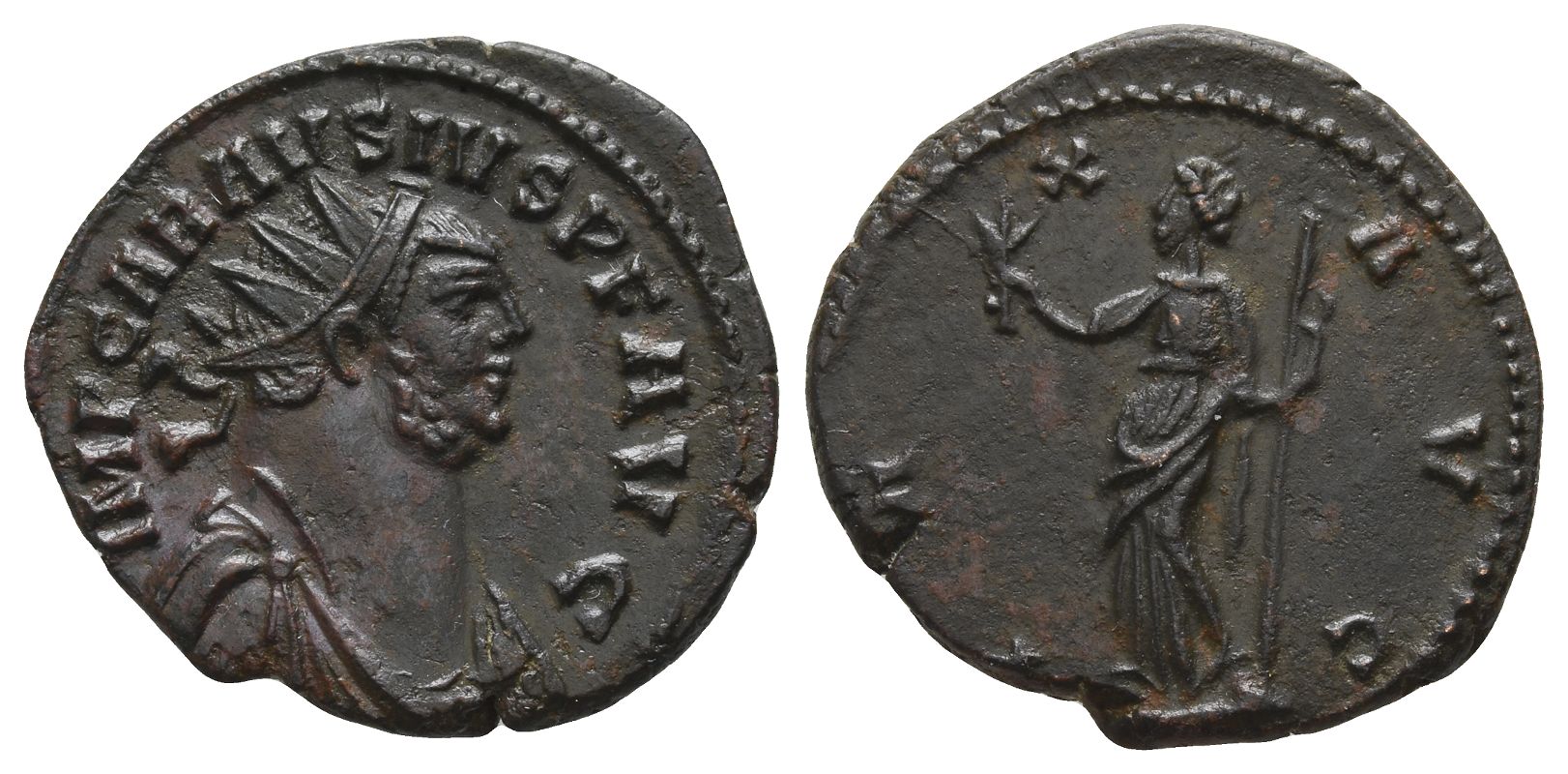 Uncertain mint; struck AD 287-290. IMP CARAVSIVS P F AVG, radiate, draped, and cuirassed bust to right / PAX AVG, Pax standing to left, holding olive branch with right hand and vertical sceptre with left. RIC V 880. 4.53gr, 22mm, 11h