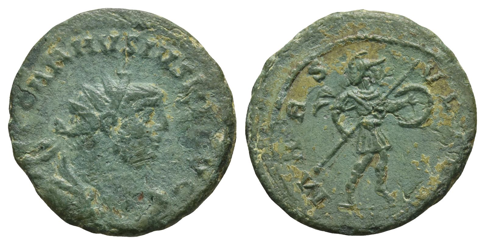 Uncertain mint. IMP CARAVSIVS P F AVG, radiate, draped and cuirassed(?) bust to right / MARS VLTOR, Mars advancing to right in military attire, holding spear in his right hand and shield in his left. Cf. RIC V.2 848 (Unattributed). 3.10gr, 21mm, 6h.