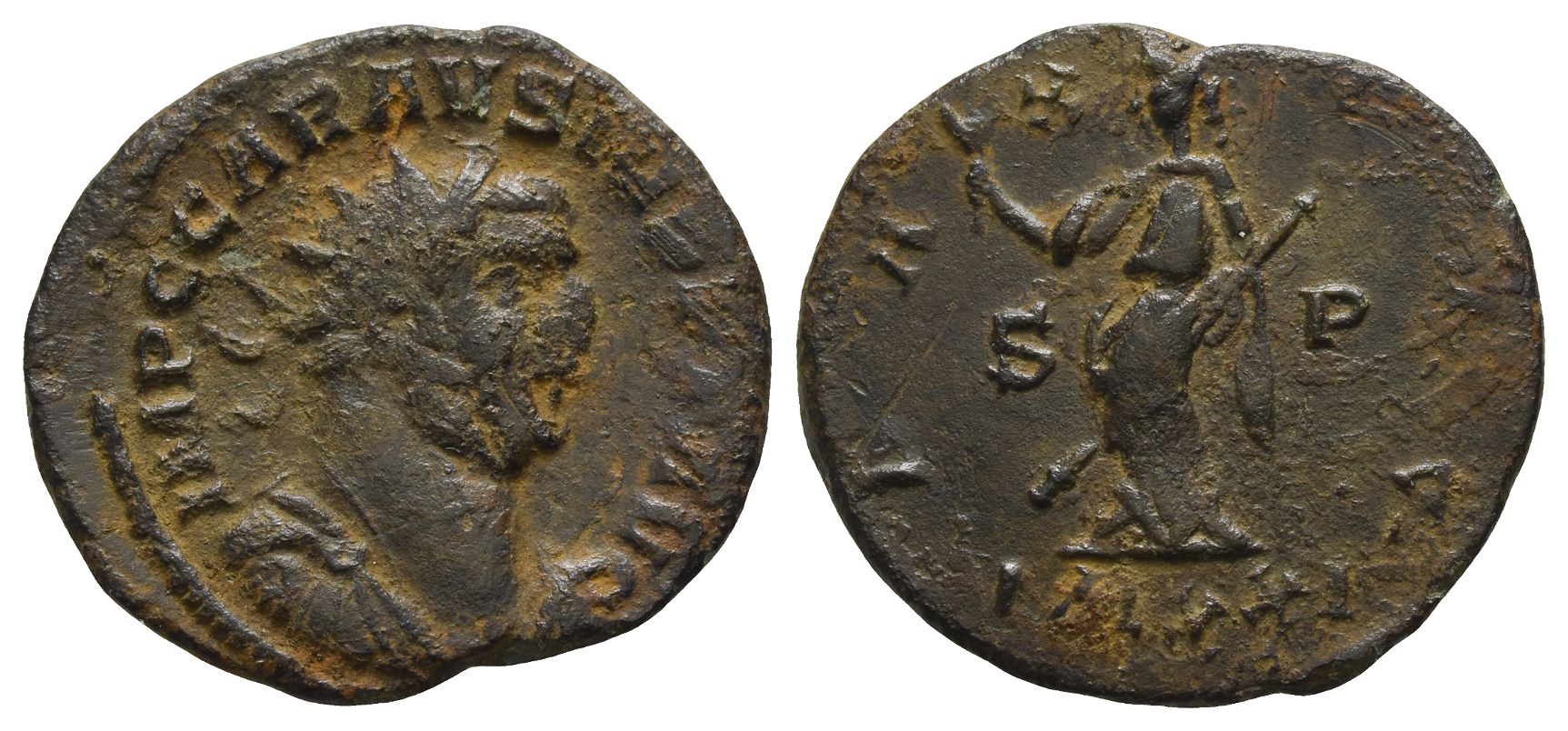 London mint; struck March AD 291 - October 292. IMP C CARAVSIVS P F AVG, radiate, draped and cuirassed bust to right / PAX [AVG], Pax standing to left, holding olive-branch and transverse sceptre; S in left field, P in right field, MLXXI in exergue. RIC V.2 118; Webb 139. 3.17gr, 24mm, 6h.