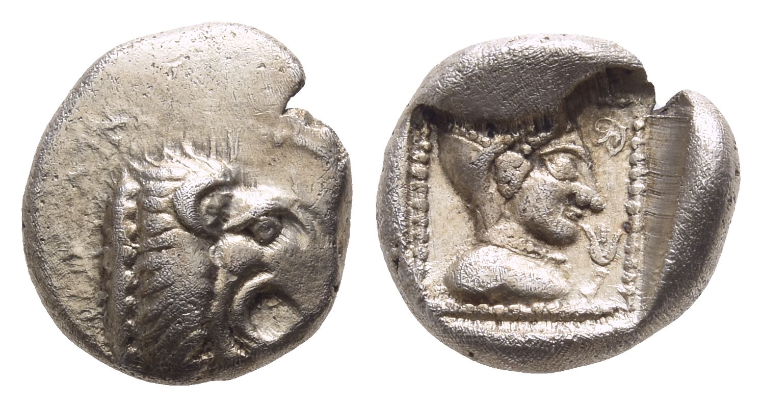 Head of lion to right / Head of Aphrodite to right; palmette to upper right, lotus flower to lower right; all in dotted square within incuse square. Cahn Series I, 18 var. (V6/R– [unlisted rev. die]); HN Online 596 (same dies as illustration); Peus Nachfolger, 428, 266; CNG, Triton XXVII, 5238. 1.75gr, 12mm, 9h.
