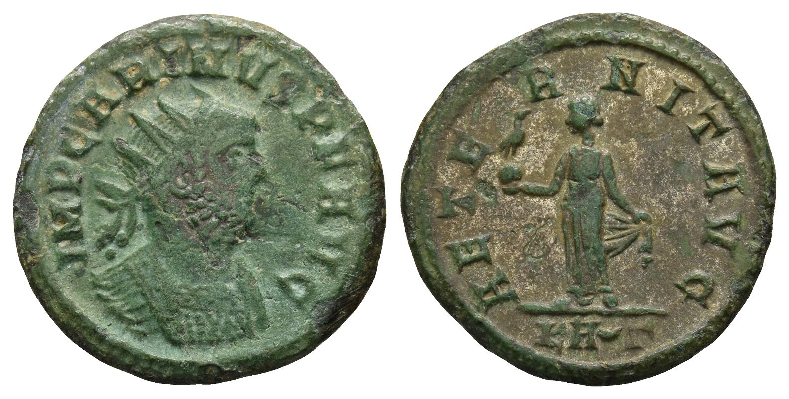 Rome mint; struck AD 285. 3rd officina. IMP CARINVS P F AVG, radiate and cuirassed bust to right / AETERNIT AVG, Aeternitas standing to left, holding Phoenix on globe and raising fold of skirt; KA(crescent)Γ in exergue. RIC V 244; Cohen 10; Pink VI/2, p. 39. 2.81gr, 21mm, 11h